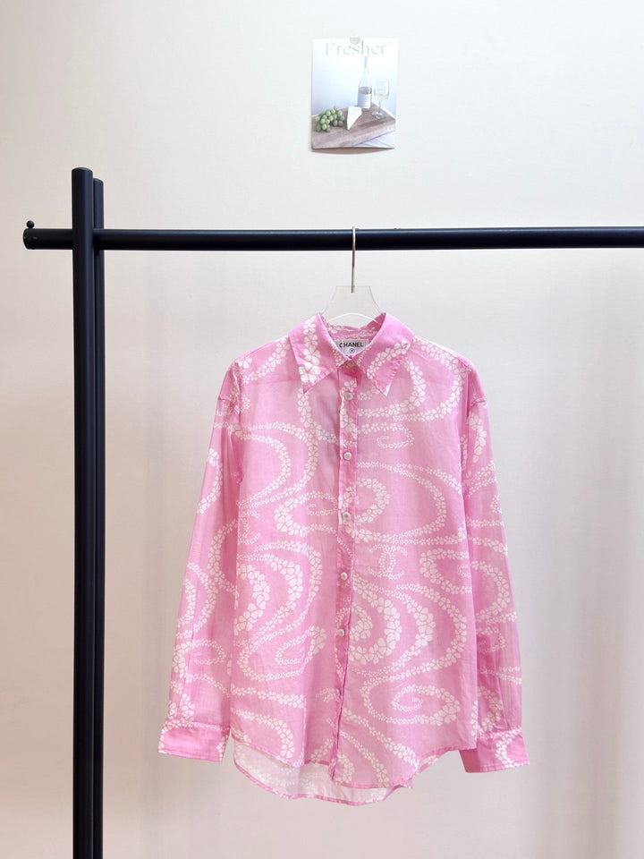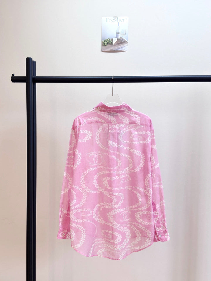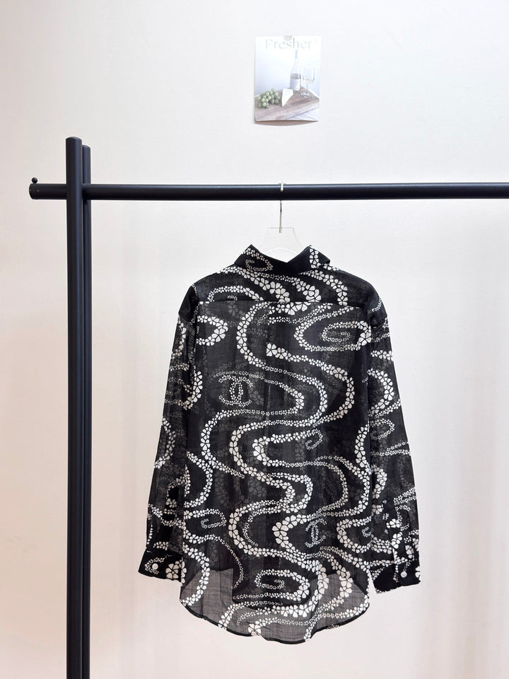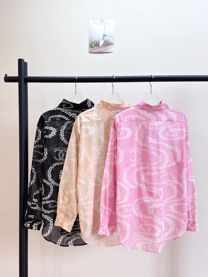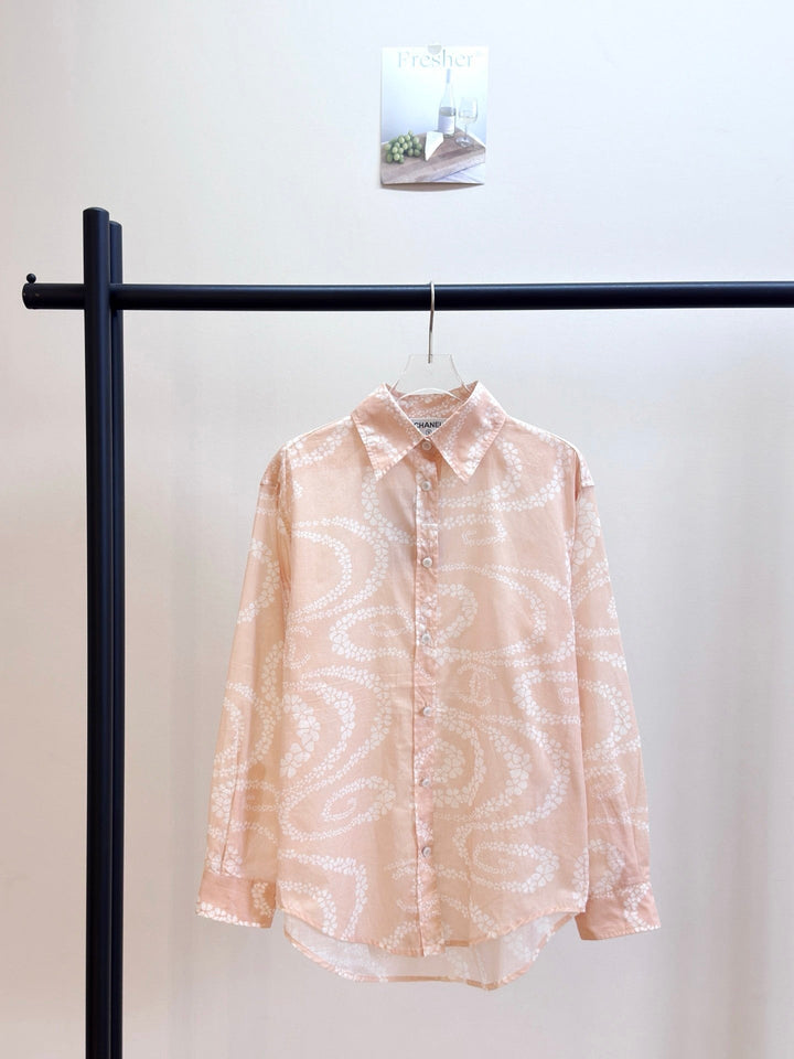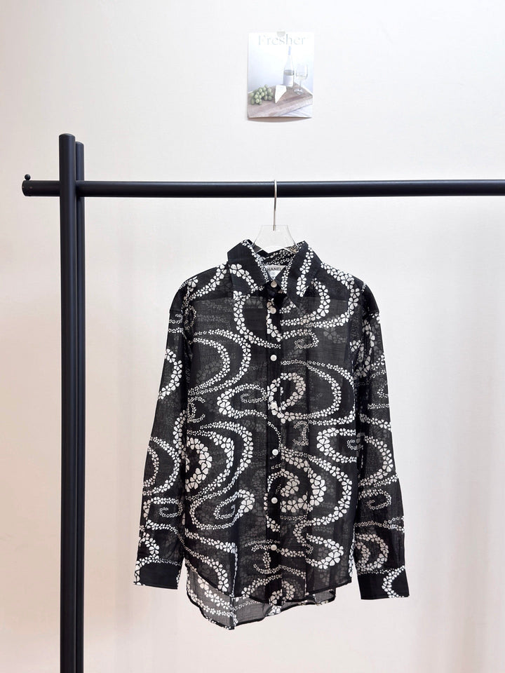 Long-sleeved shirt with a turn-down collar and a straight, loose fit.