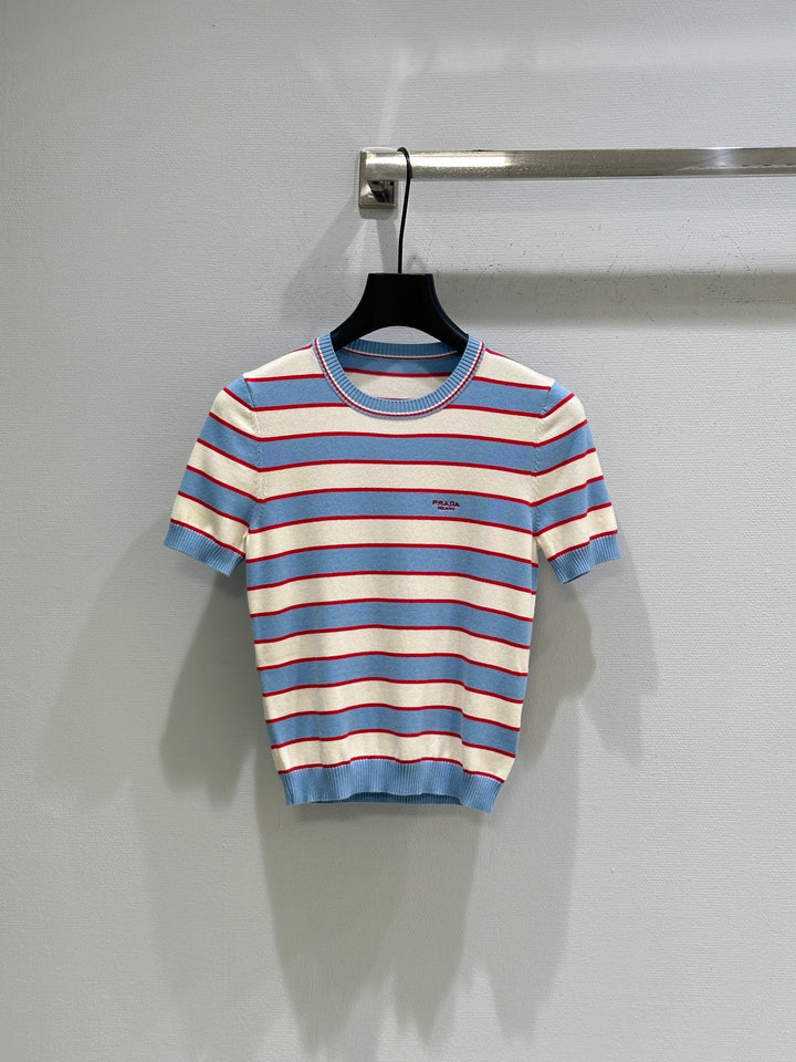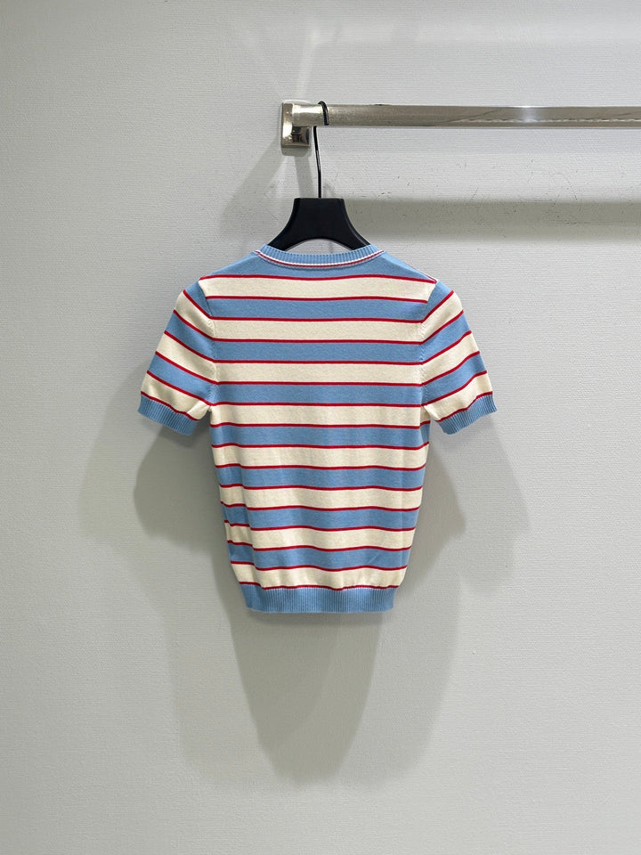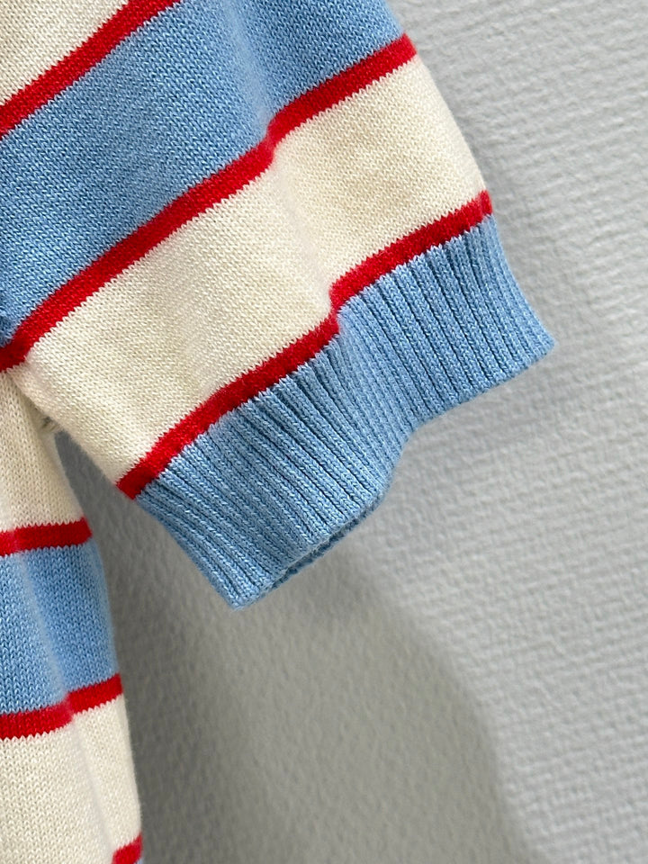 🛒New arrival for summer 25S! This slim-fit, short-sleeved sweater features a vibrant, retro-chic stripe pattern. Crafted from cotton, it features a monogrammed logo embroidered on the front. Short sleeves, jersey, slim fit, ribbed crew neck, and regular shoulders.