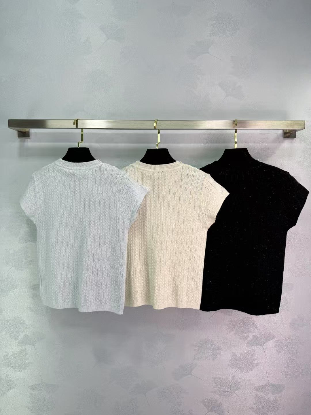 Custom-made YB wool yarn weaving, elastic and comfortable, with a rich texture. Short-sleeved top cut to highlight the brand's style. Made of wool with elasticity, creating a slimming visual effect. The entire garment features a delicate vertical cable knit texture. The collar is adorned with pearl-sewn beads, complemented by double C-shaped rhinestones on the chest for rich details. The design highlights transform a simple basic style into a fashionable piece. Silver thread integrated, exuding a sophisticated aesthetic. Whether worn alone or layered, it stands out as a stylish piece. Available in 3 colors.