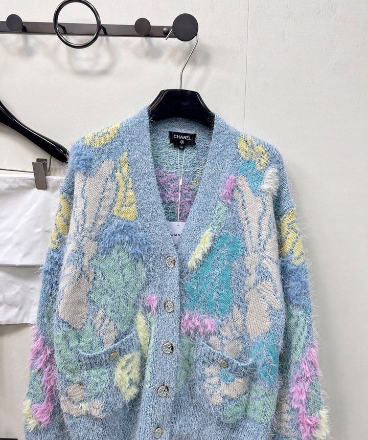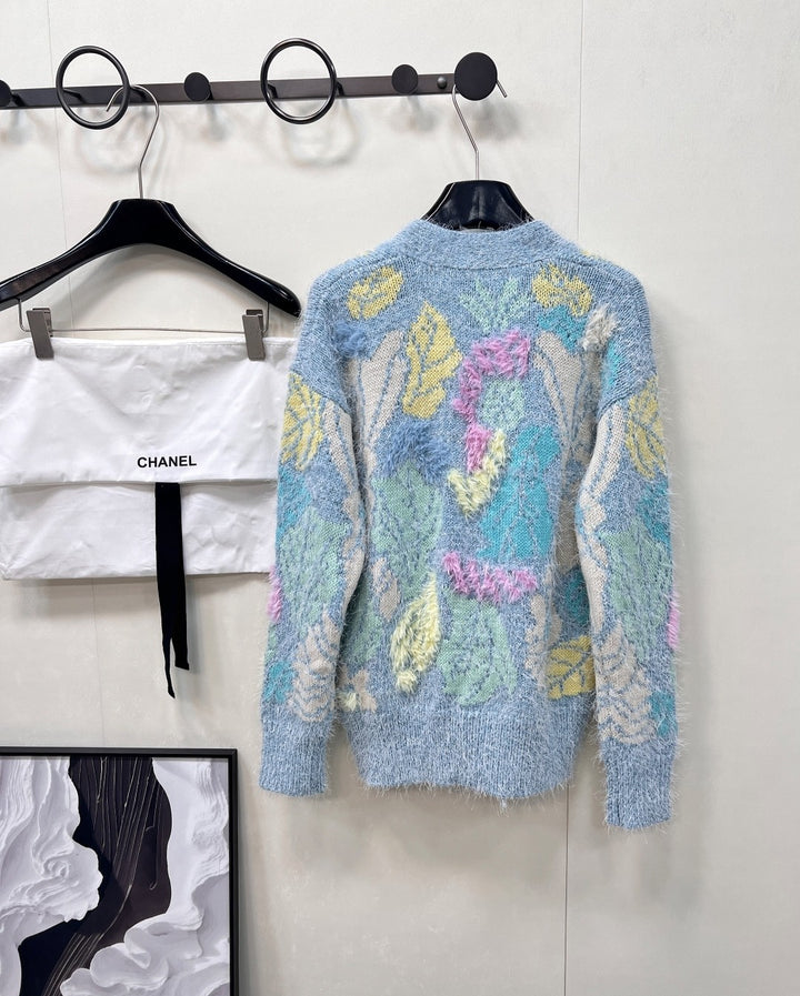 25 new knitted cardigan for early autumn, with high-end and comfortable texture, comfortable to wear and not tight, V-neck knitted cardigan cut with fine stitches, exquisite and breathable, loose silhouette visually slimming, blue, green and yellow color matching is fresh and fairy-like, showing a light luxury and fashionable temperament.