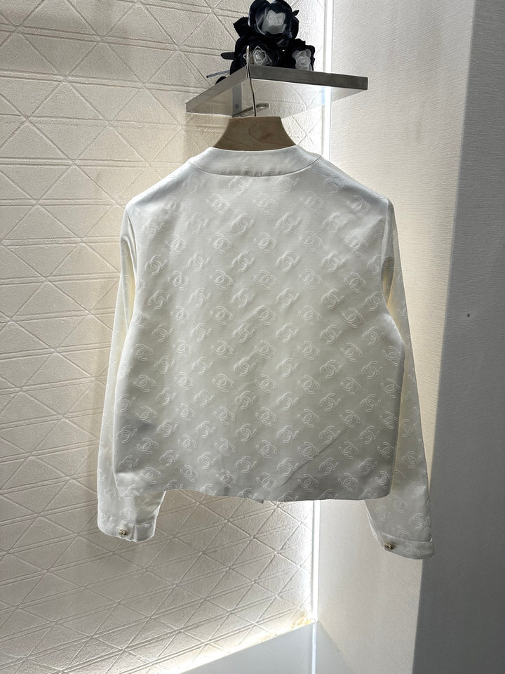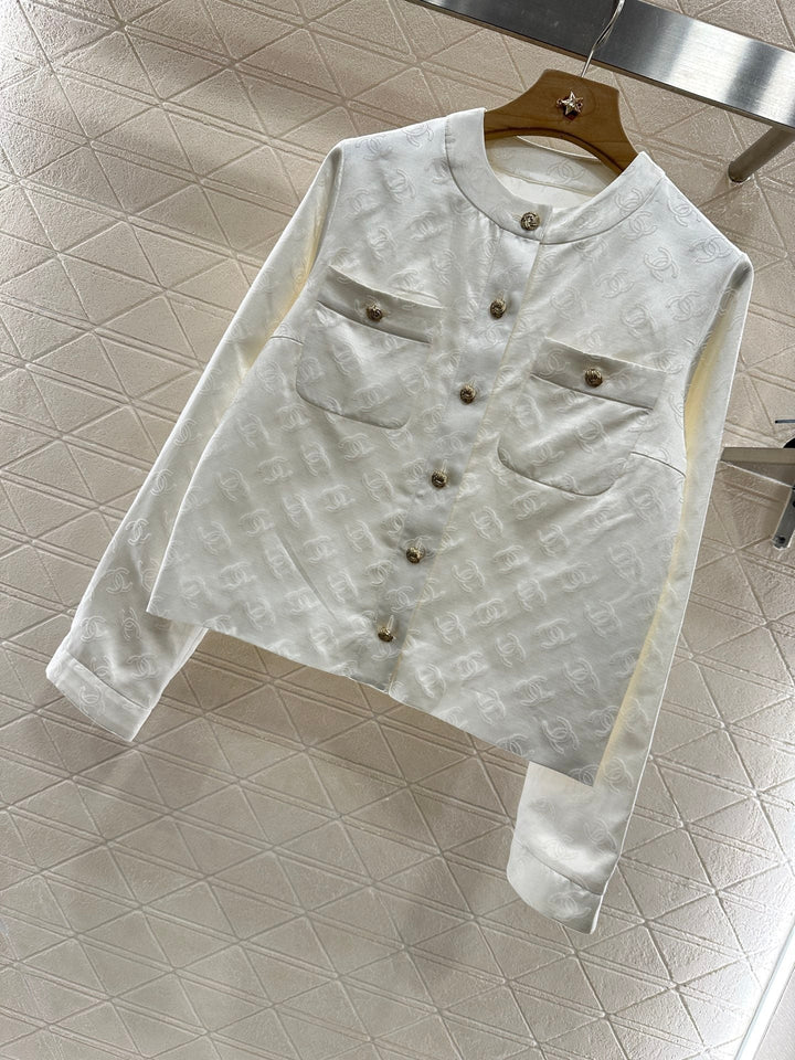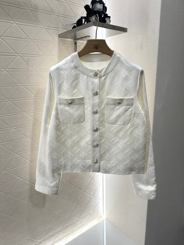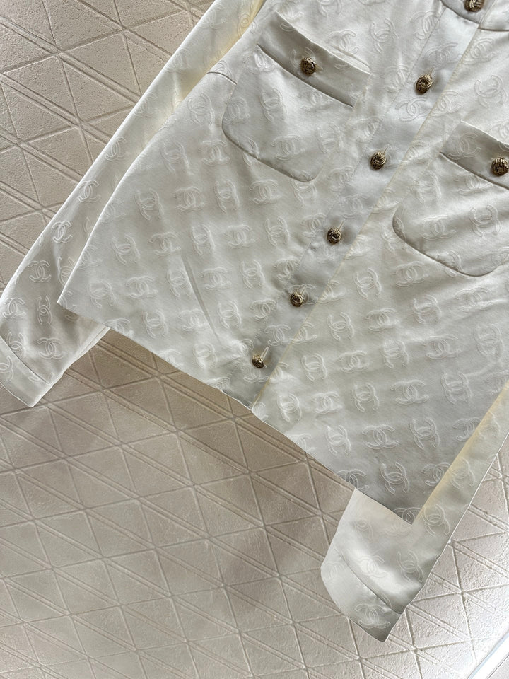 Silk-cotton jacquard fabric with a luxurious texture, smooth and skin-friendly, structured and well-defined. A tailored shirt jacket with a rounded collar and straight shoulders. The entire garment features a full jacquard pattern of double C letters, setting a minimalist and fashionable tone while highlighting the brand's premium style. The front of the jacket is adorned with a buttoned collar and a bow tie. Symmetrical pockets with rich details, sharp tailoring that flatters the figure, effortlessly exuding high-end elegance. Stylish and graceful, perfect for daily commuting. Custom-made fabric and lining, choose the high-end version.