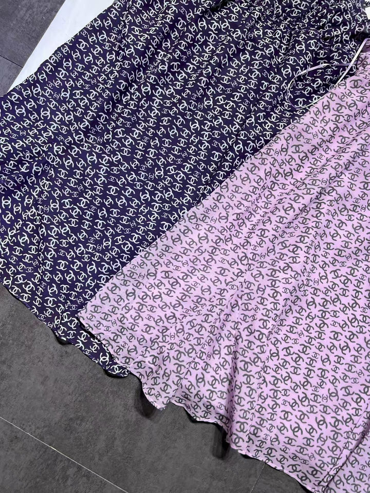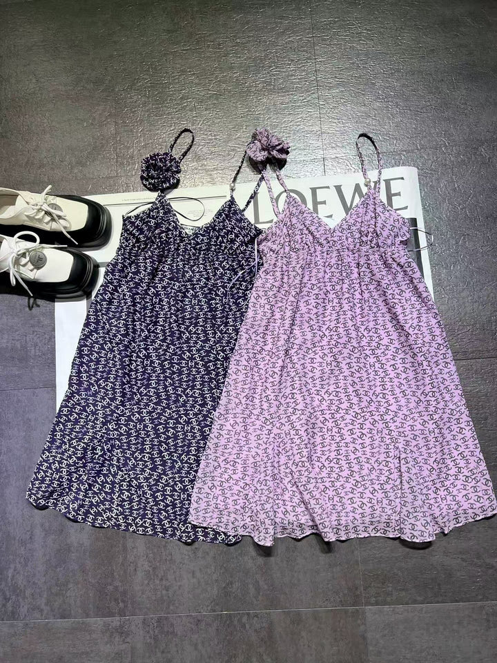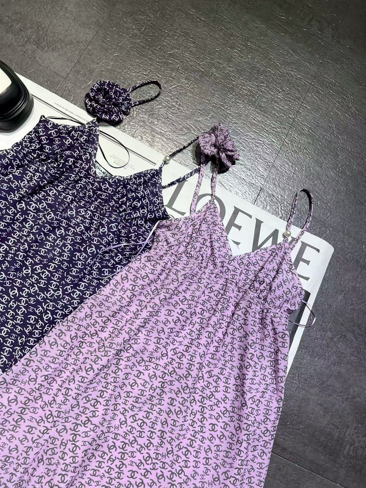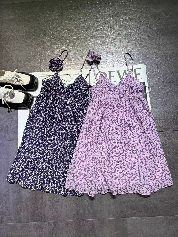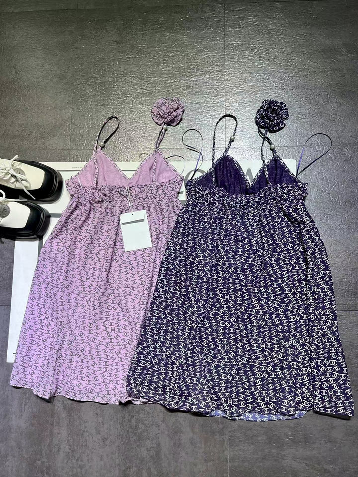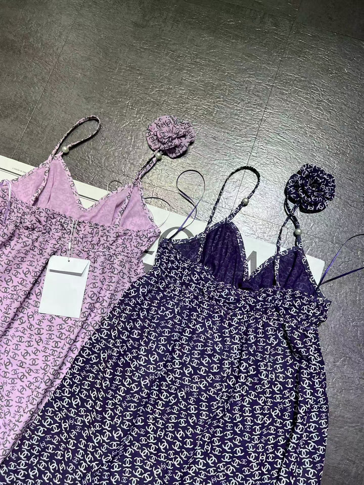 High-end custom made silk gauze material. Light and comfortable, flowing and light. Spaghetti strap dress cut, with V-neck design to fit the chest line. Showing charming clavicle and modifying shoulder line. The garment is printed with active printing technology to present a full double C pattern. It is very sweet and decorated with three-dimensional handmade camellia decoration, showing the brand style. A must-have for holiday dating. Available now SML
