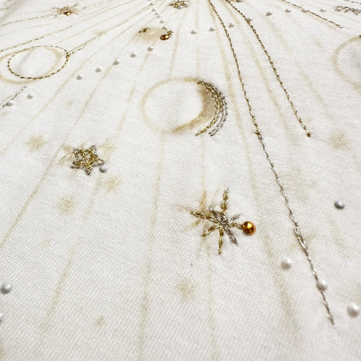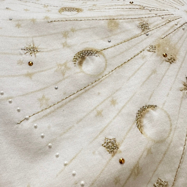 Crafted from a white cotton and linen blend plain knit fabric, it is embellished with a sunburst floral print. The round neck design makes it an ideal choice for any season, and it can be paired with matching shorts for a more refined look.