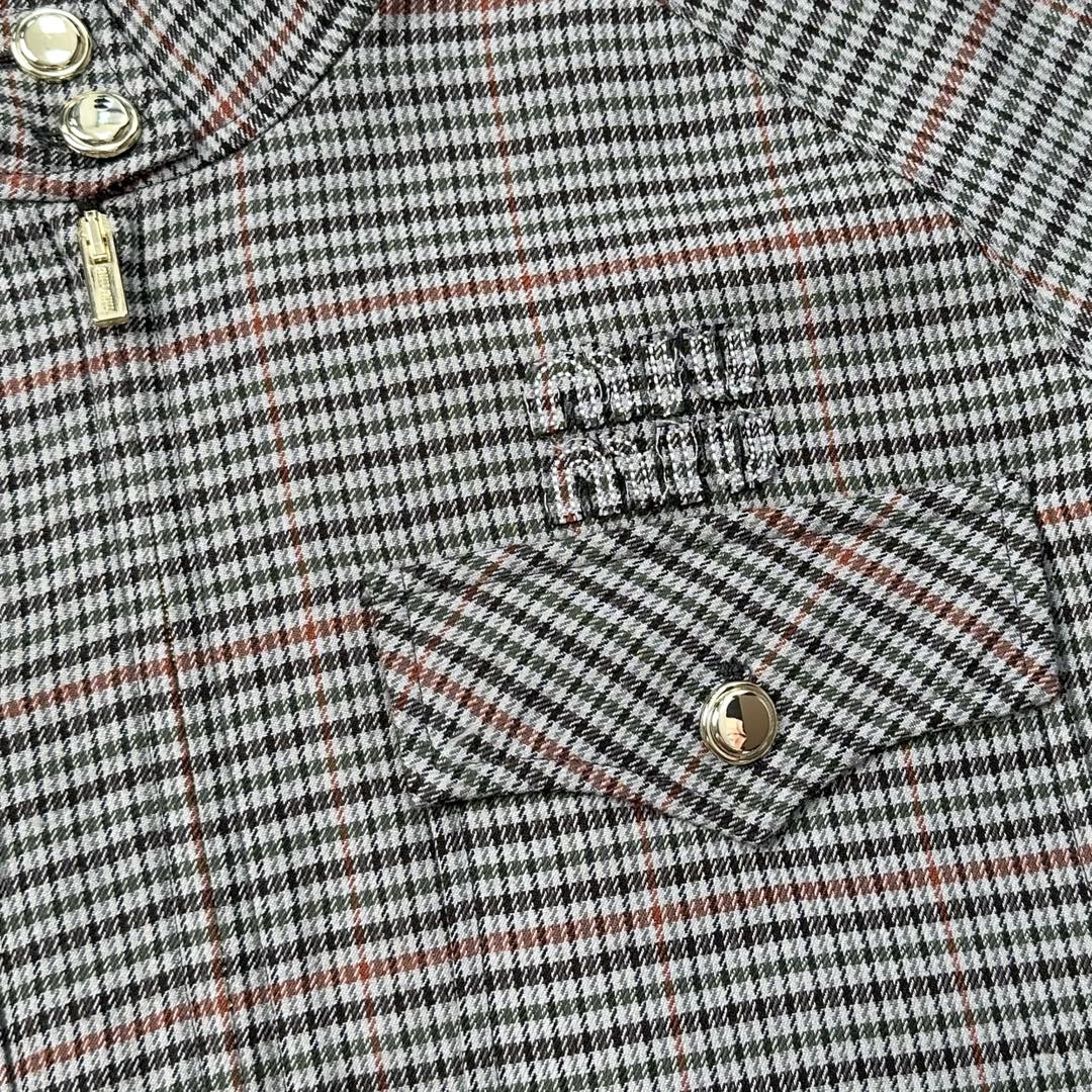! This short jacket features a sophisticated plaid print and sporty details. Stylish and decorated with embroidered logos, it shows a classic style. Paired with the same skirt, it is sweet and cool, and the custom metal buckle belt is super beautiful!