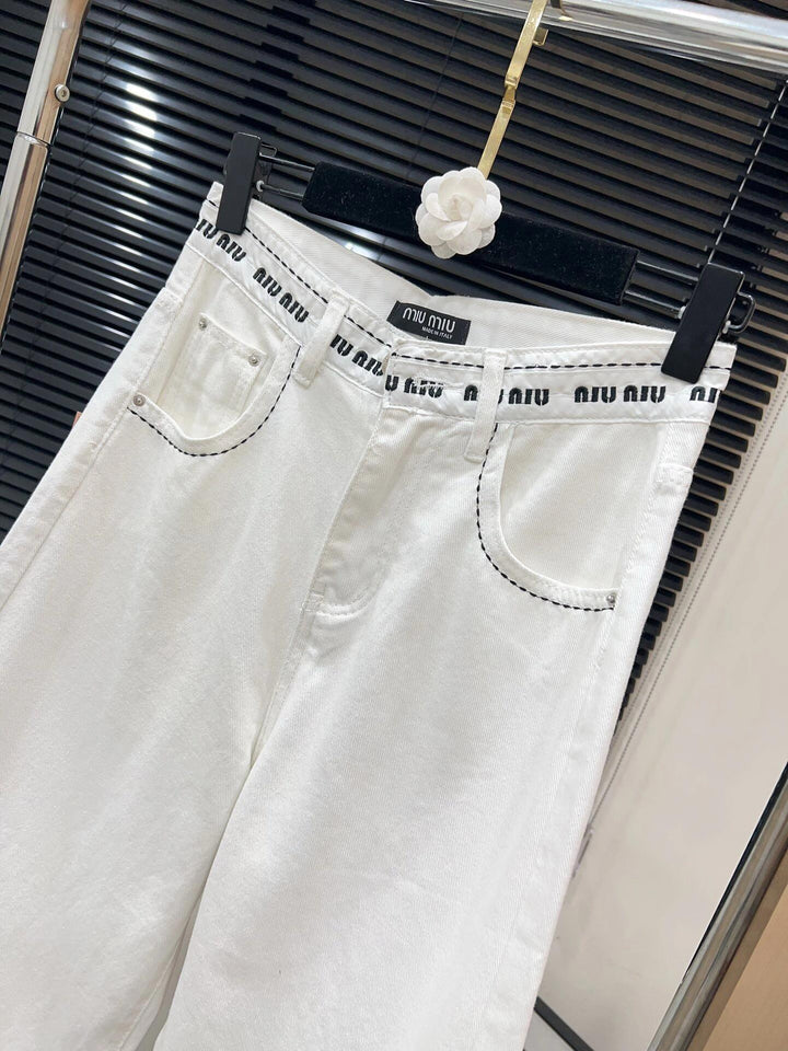 White jeans with logo on waist