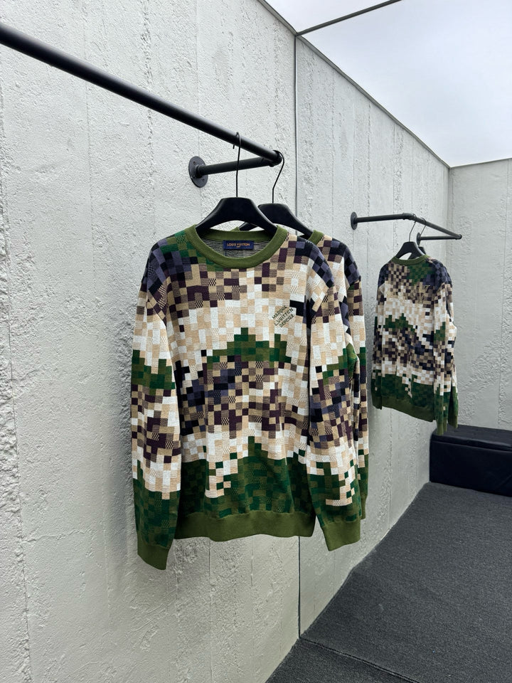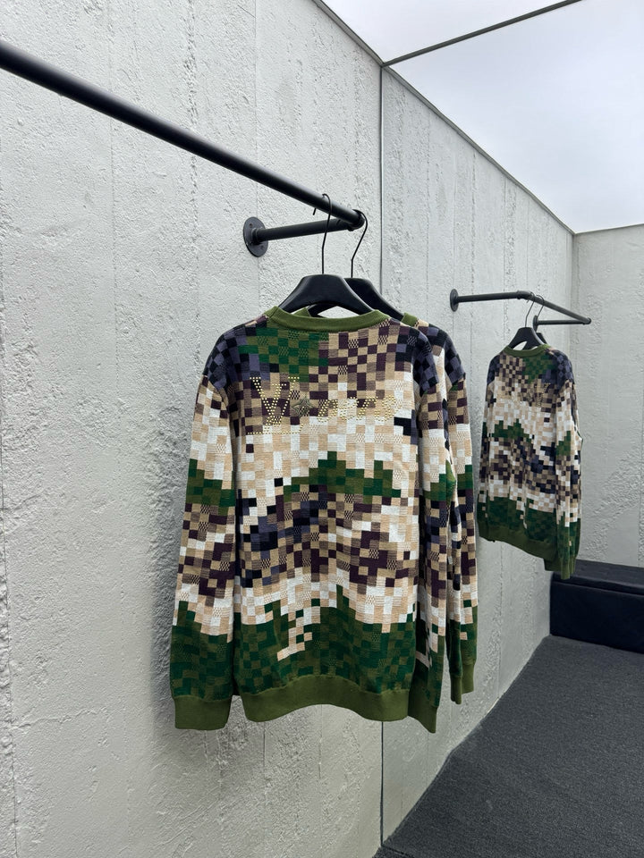 Camouflage Green Checkered Knit Sweater