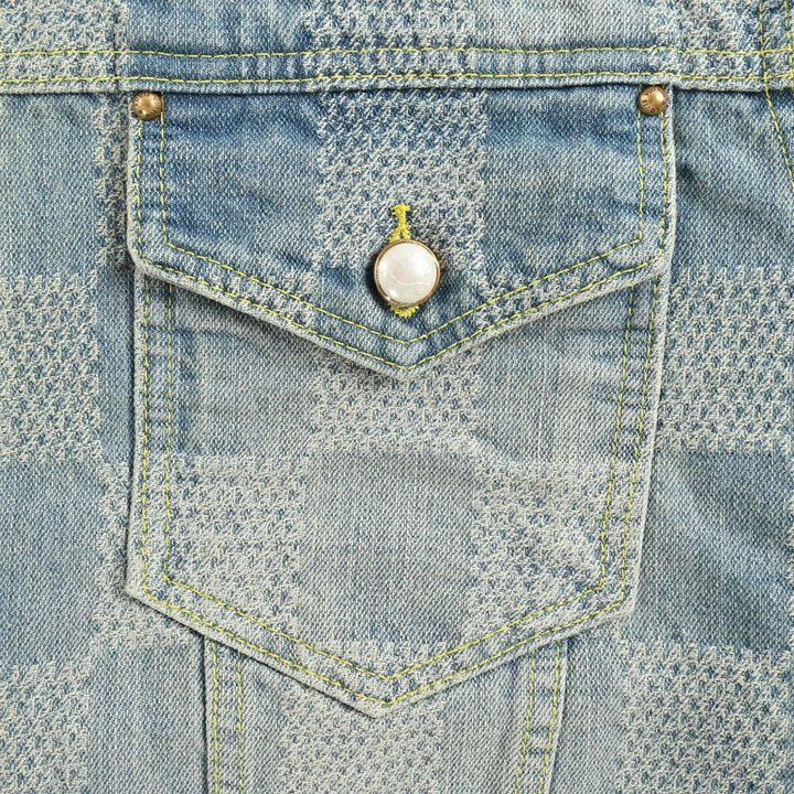 The fabric is made of custom-woven denim denim, and is custom-dyed with a 3D checkered jacquard process to create a contrasting indigo effect. Through the yarn-dyed jacquard process, various patterns and patterns are woven directly into the fabric during the weaving process, making the surface of the denim appear richer in texture and visual effects. The fabric is sand washed and special dyed. The natural wear and fading of the denim after washing gives it a whitened and aged effect, making it look more retro and historical. Opposite patch pockets are designed, the threshold is opened and closed with new pearl buttons, the pearl surface has clear and delicate engravings, environmentally friendly electroplating, genuine leather hooks are matched with bronze chains, a full set of molded custom hardware accessories, and three standard accessories are fully equipped. The lapel design and buttoned cuffs embody the dandy style of the season and match the same style of trousers