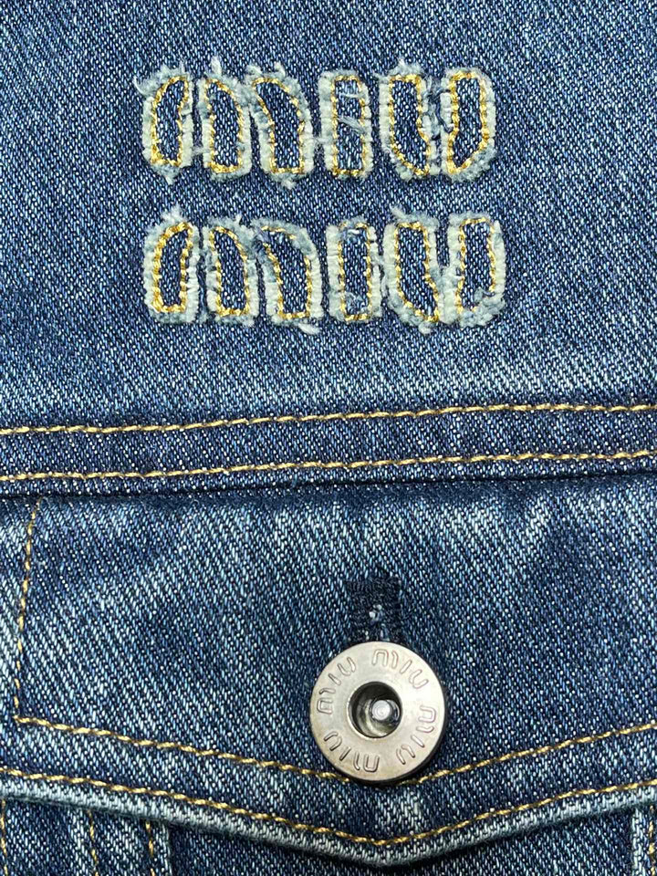 Leather trim lapel long sleeve short zip-up denim jacket
