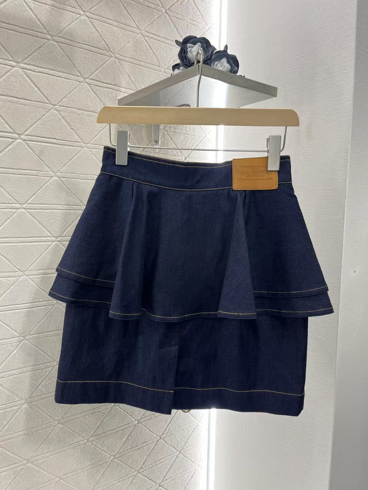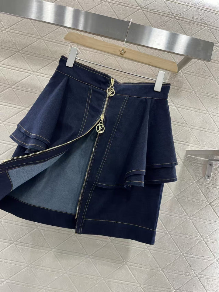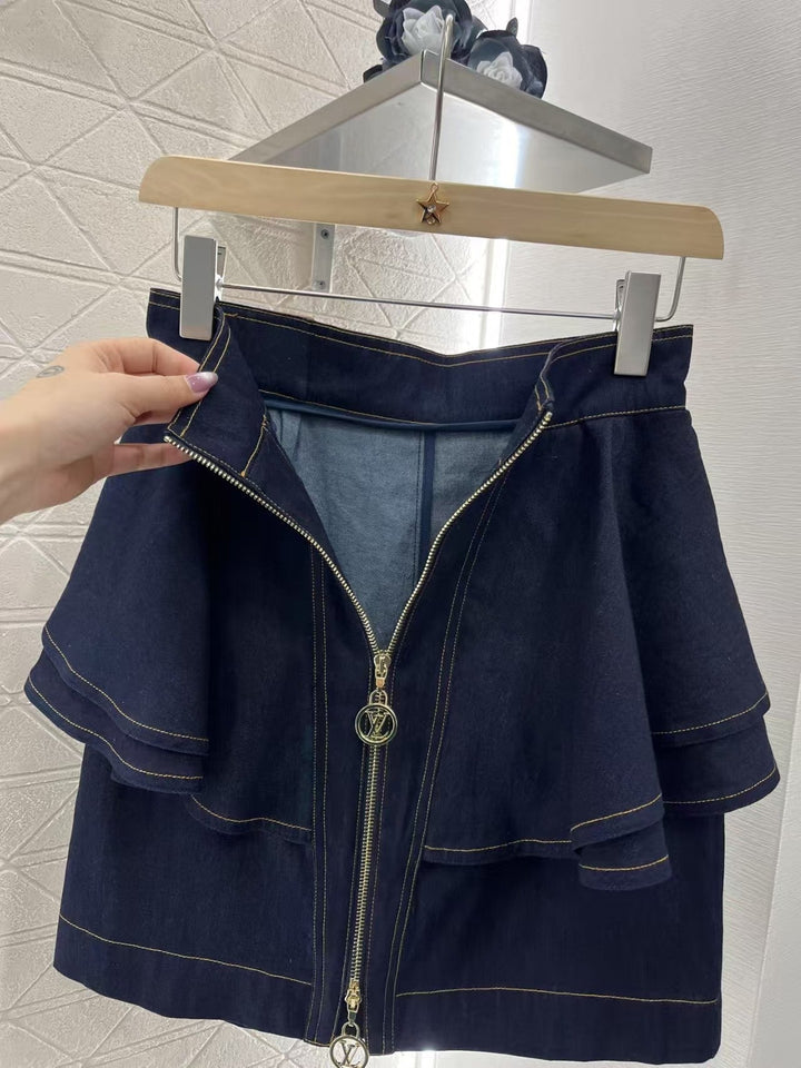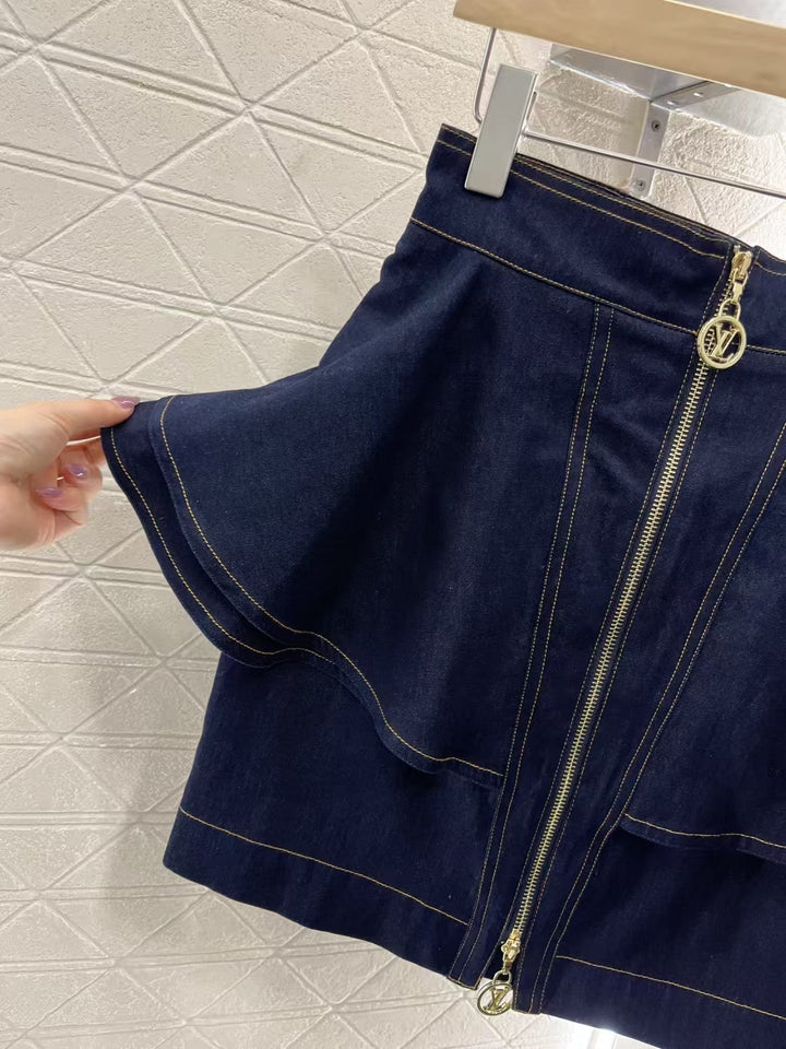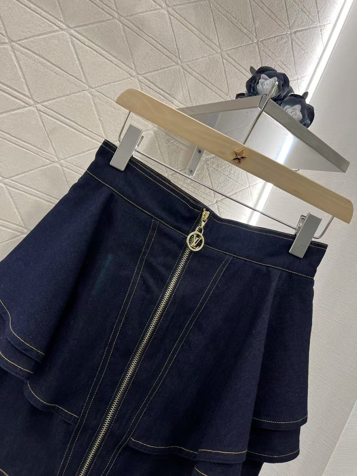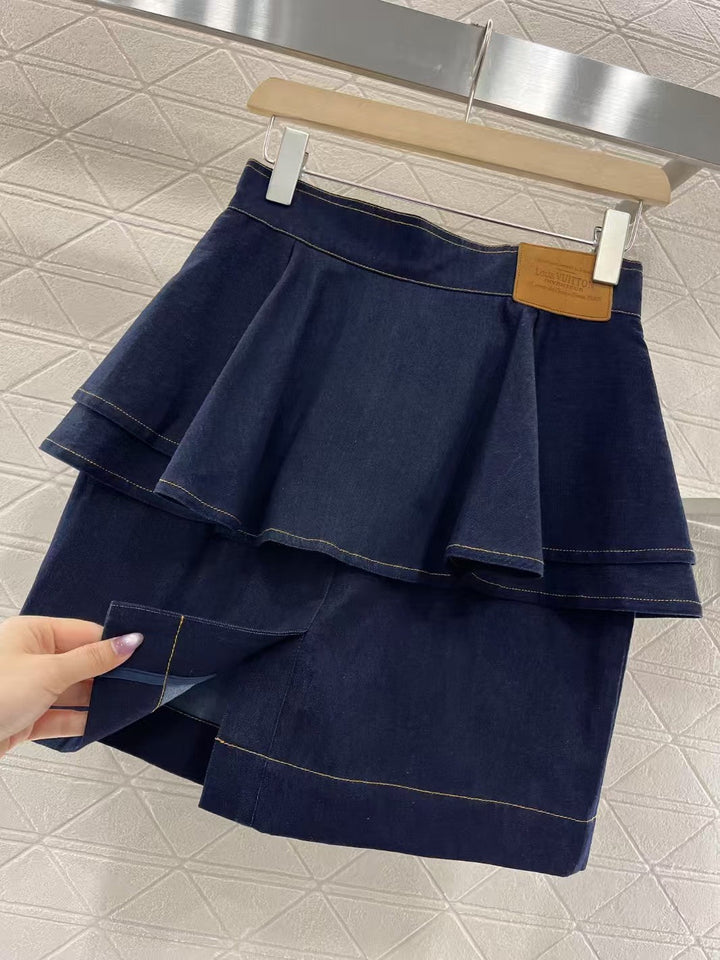 Denim ruffle straight skirt Customized yb twill cotton denim material Multiple washes for a soft and comfortable look Presenting evergreen denim blue Overall straight version Exquisite outer craftsmanship creates a layered ruffle decoration Makes the simple denim skirt no longer monotonous The front zipper is embellished with a hollow letter logo Echoing the leather label on the back waist Highlighting the high-end tone of the brand Fashionable and hot on the upper body An indispensable versatile item in the wardrobe