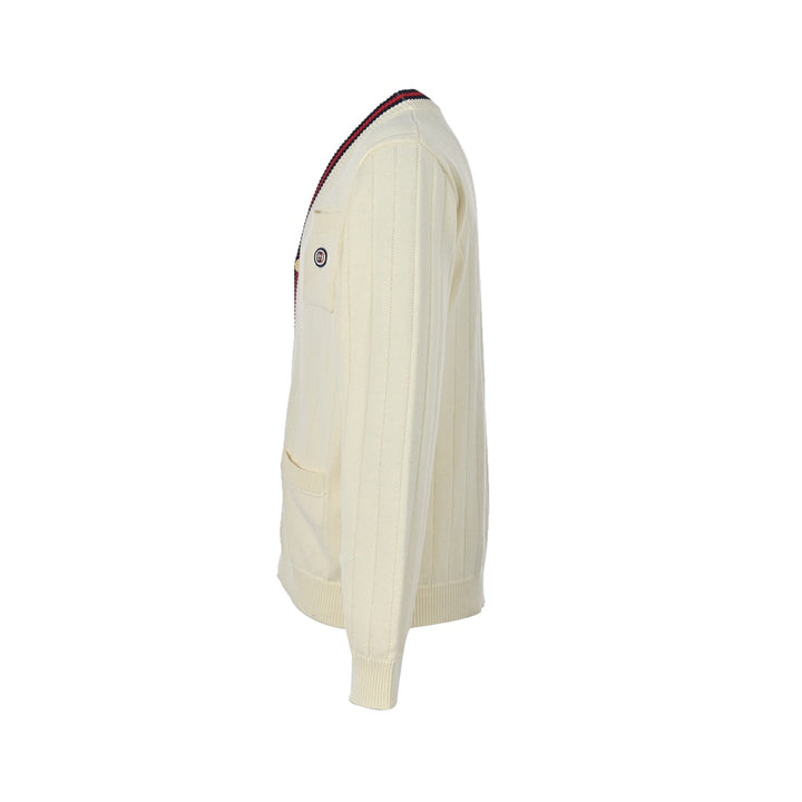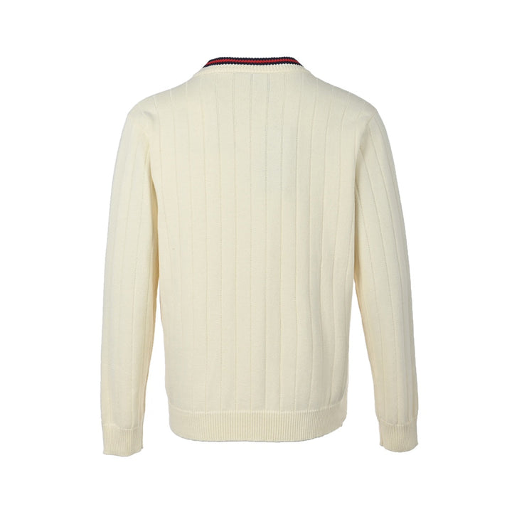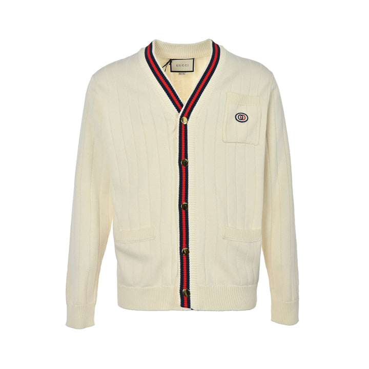 Knitted cutout sweater cardigan featuring the brand's signature elements and silhouettes. This round-neck sweater is trimmed with red webbing and designed with a floral GG pattern cutout, subtly interpreting the elements of preppy style. Preppy style is a style of clothing originating from the Ivy League schools in the northeastern United States, which continues to influence Gu's design direction. Classic knitwear is reimagined with sophisticated details and iconic brand elements.