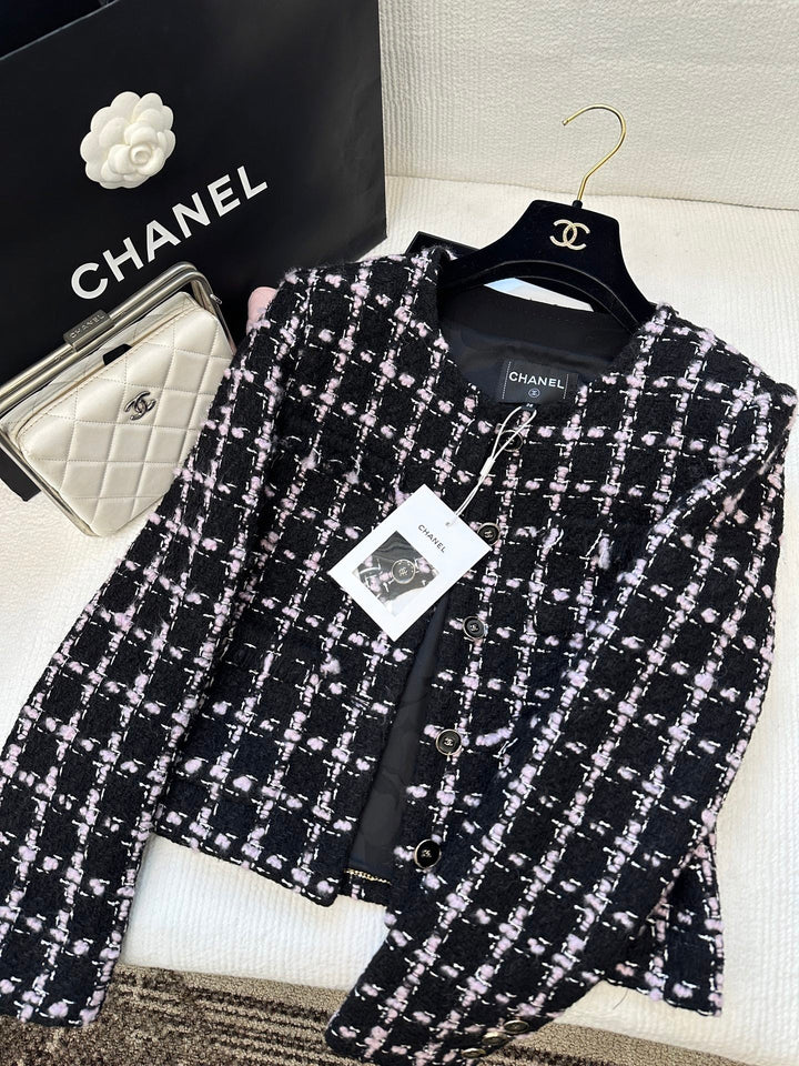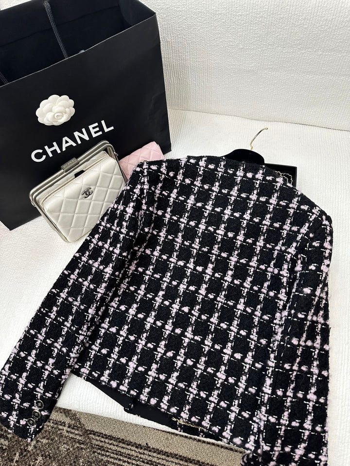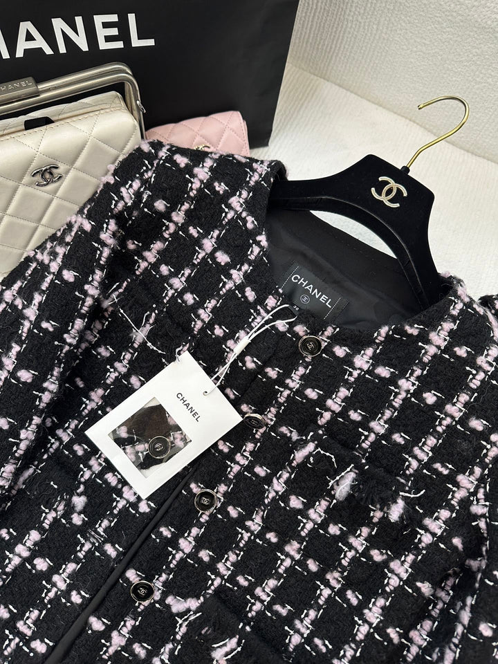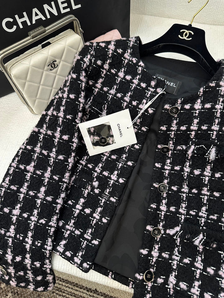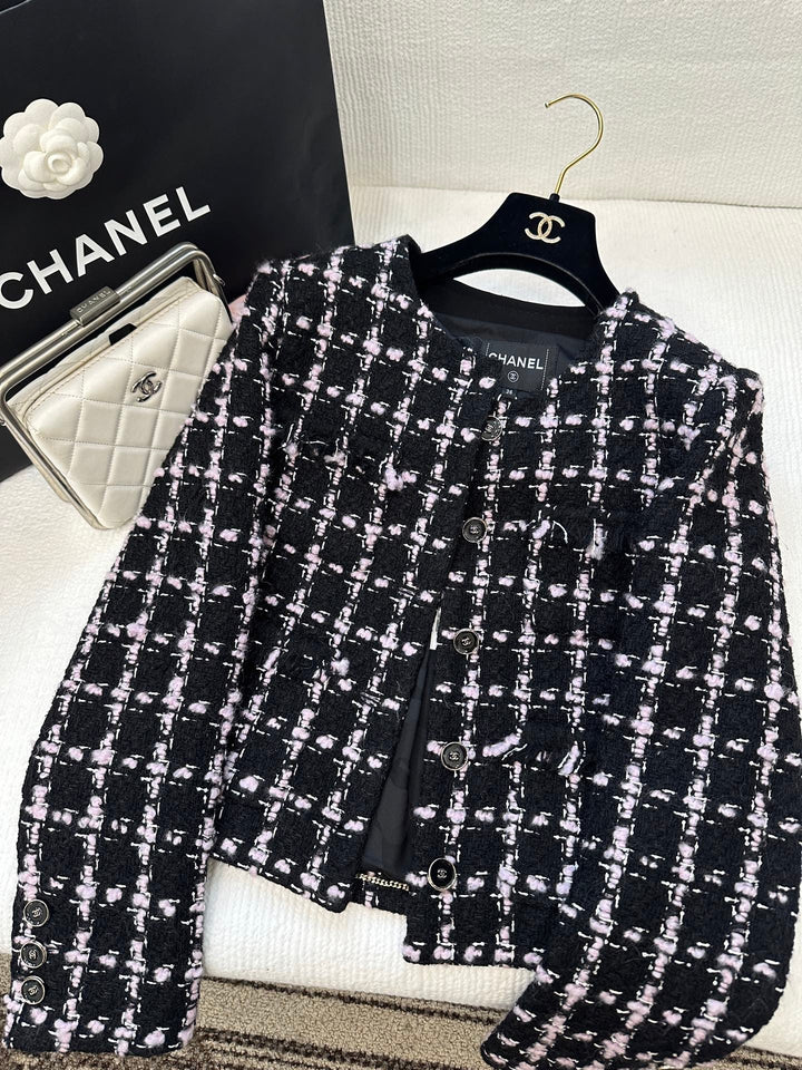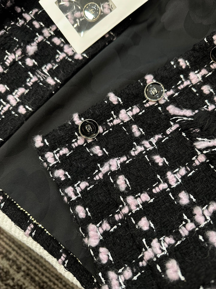Made from imported woolen tweed, the texture is so pronounced that the wool is visible to the naked eye, creating a premium feel. This coarse, striped tweed fabric embodies a ladylike style. This round-neck jacket features padded shoulders and a single row of printed buttons on the front. The delicate pink and black woven texture creates a luxurious yet elegant look. Quilted fringe trims at the waist and pocket edges create an elegant and captivating look for the fashionista.