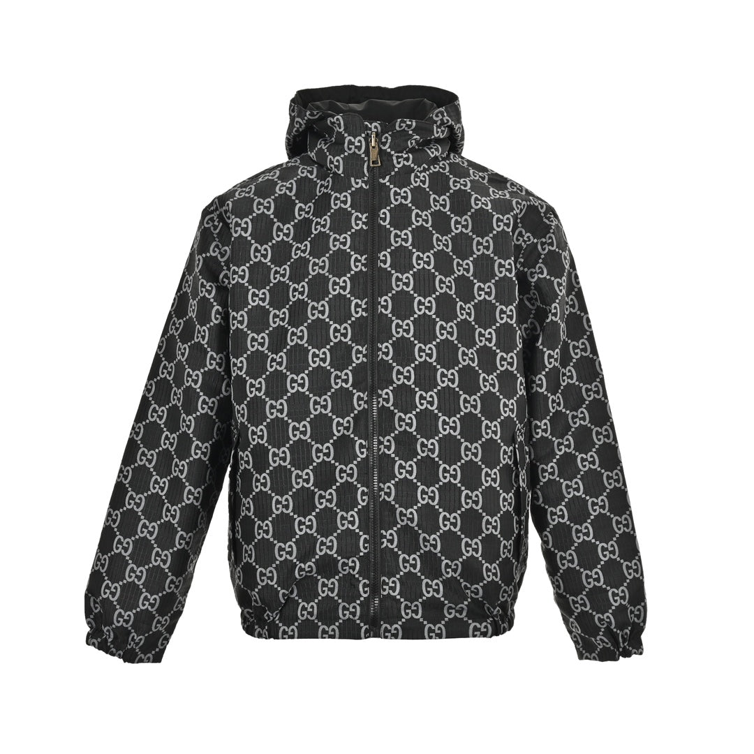 This casual reversible jacket is crafted from black and gray nylon plaid nylon and features a concealed hood and leather patches.