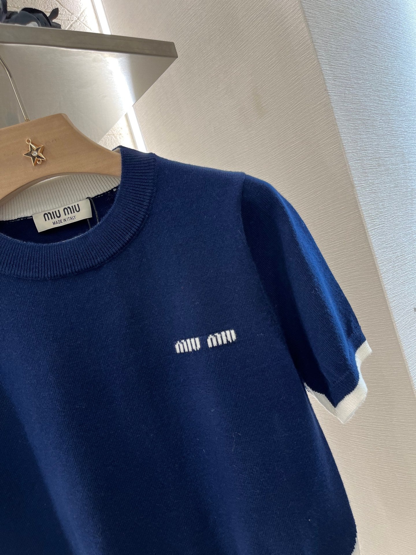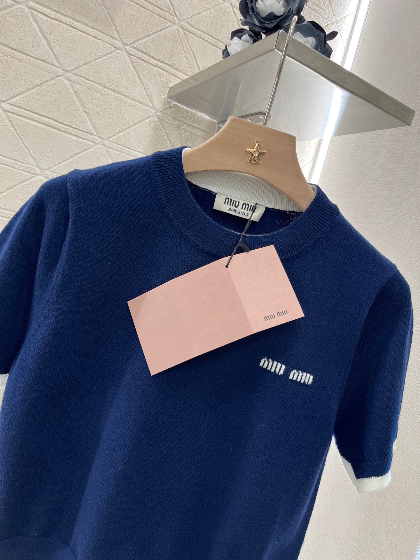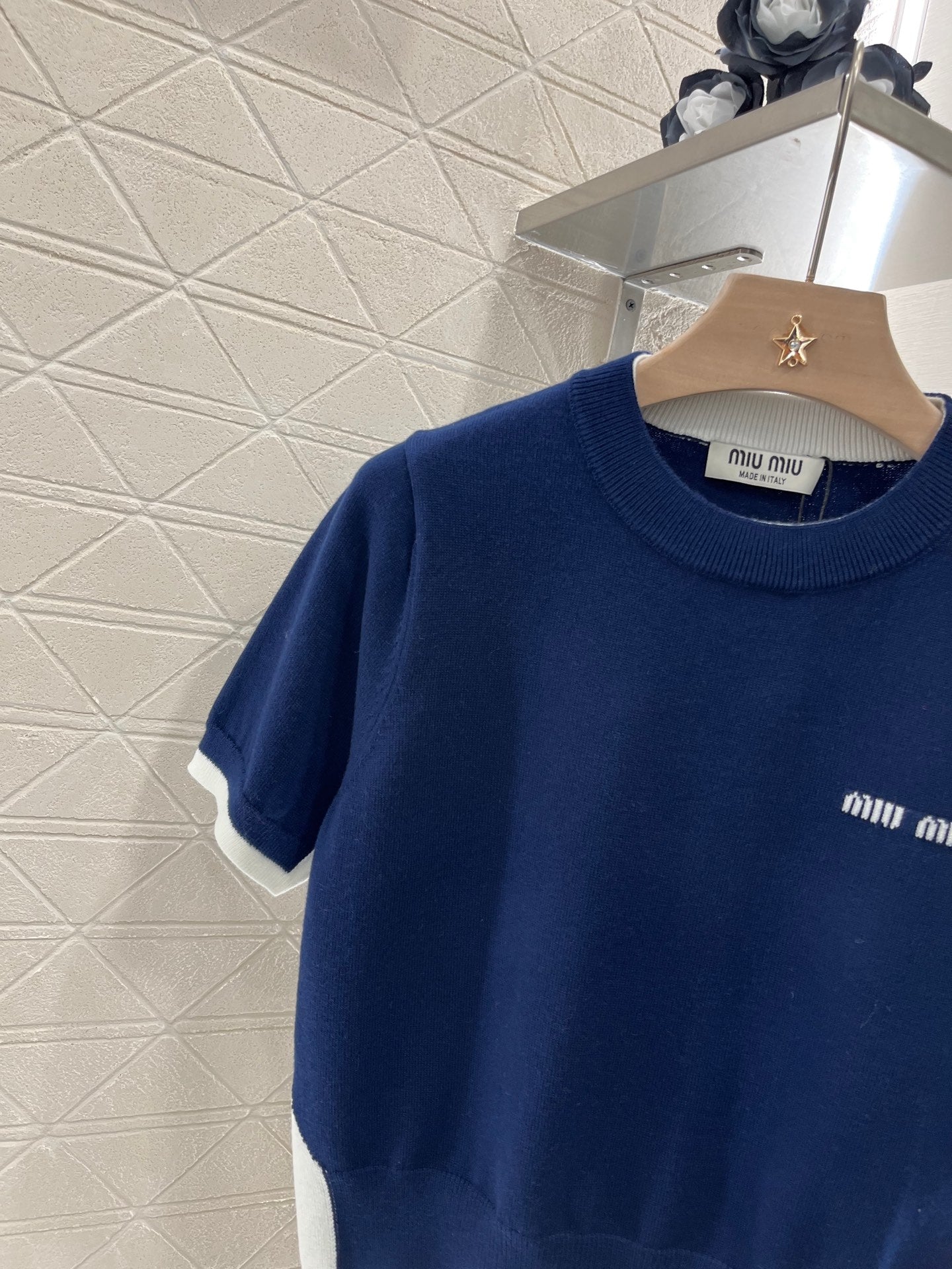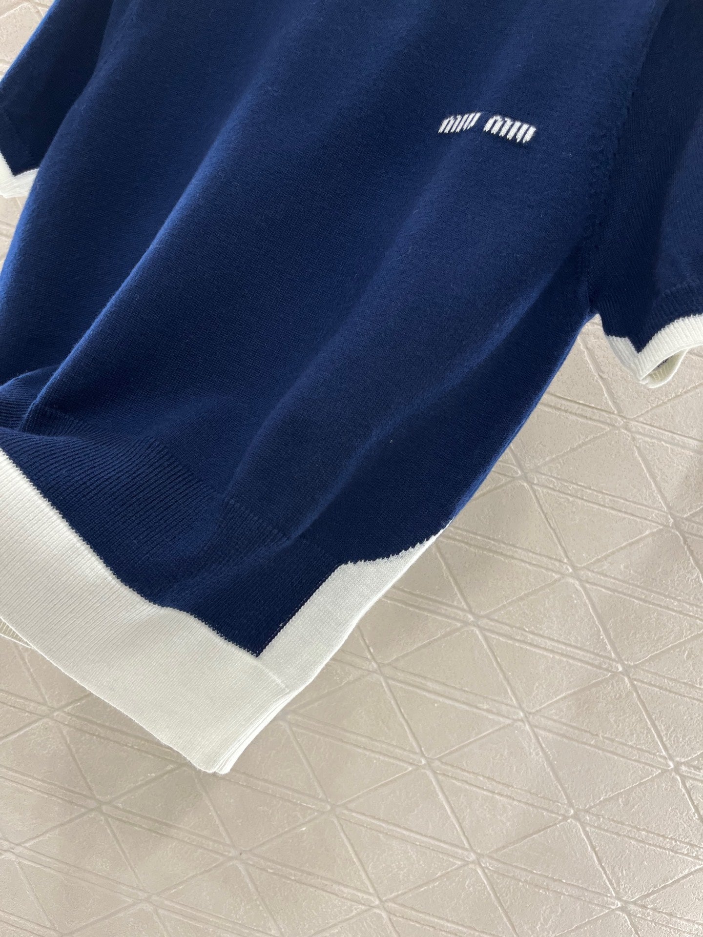 Wool yarn material, delicate texture, soft and comfortable Round neck knitted short-sleeved cut Fine knitting throughout Light-colored ribbed edging + widened hem details add exquisite tone Matching elastic fabric Loose version makes you look slimmer and more tolerant of your figure Letter logo on the chest to show the brand tone Versatile style regardless of age and skin color Matching skirts and pants Suitable for age-reducing, fashionable and retro style Customized fabrics