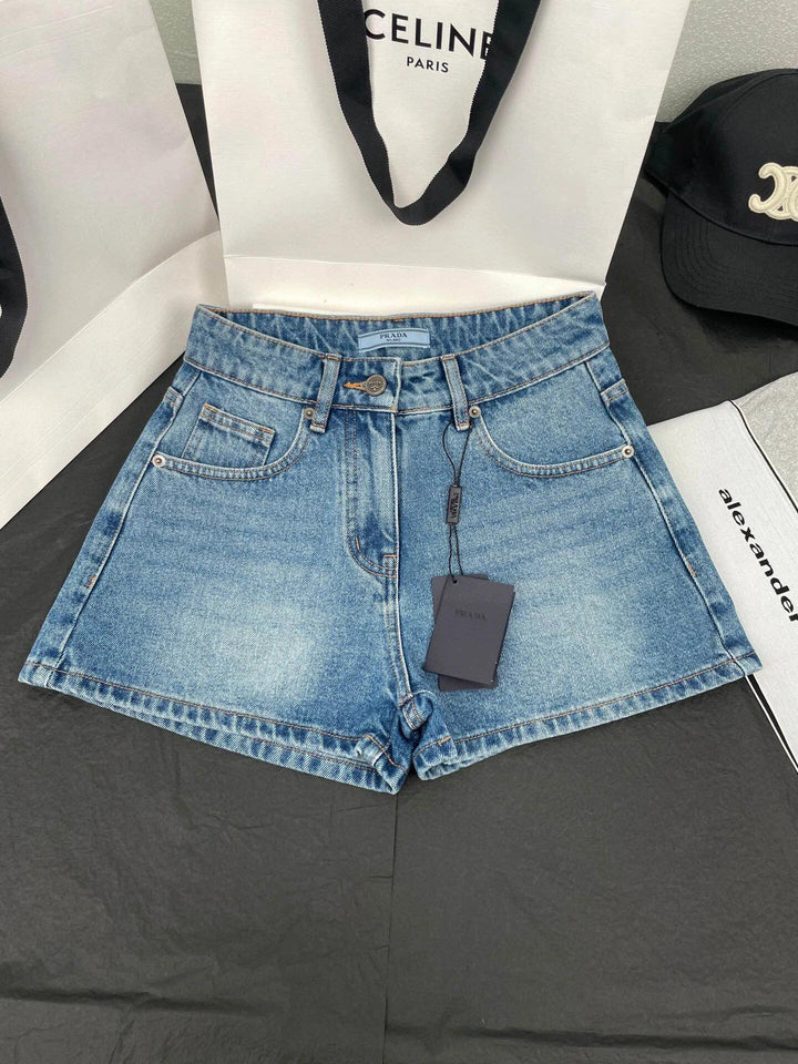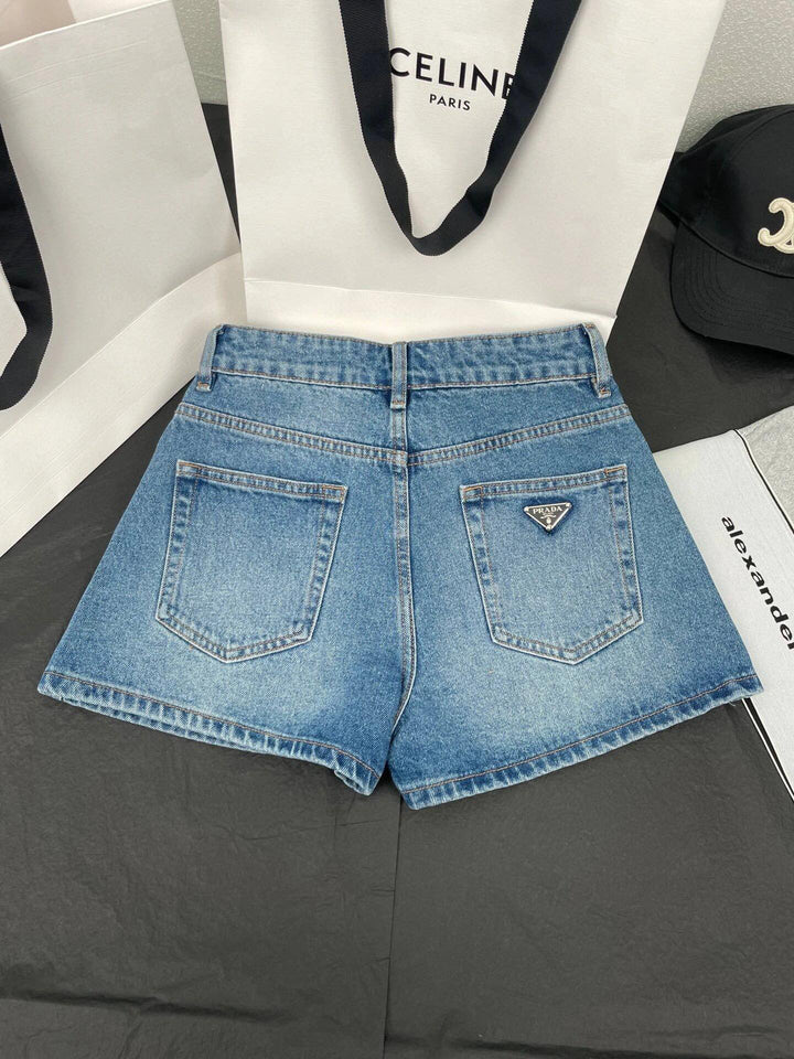 Contrast color high waist washed denim shorts