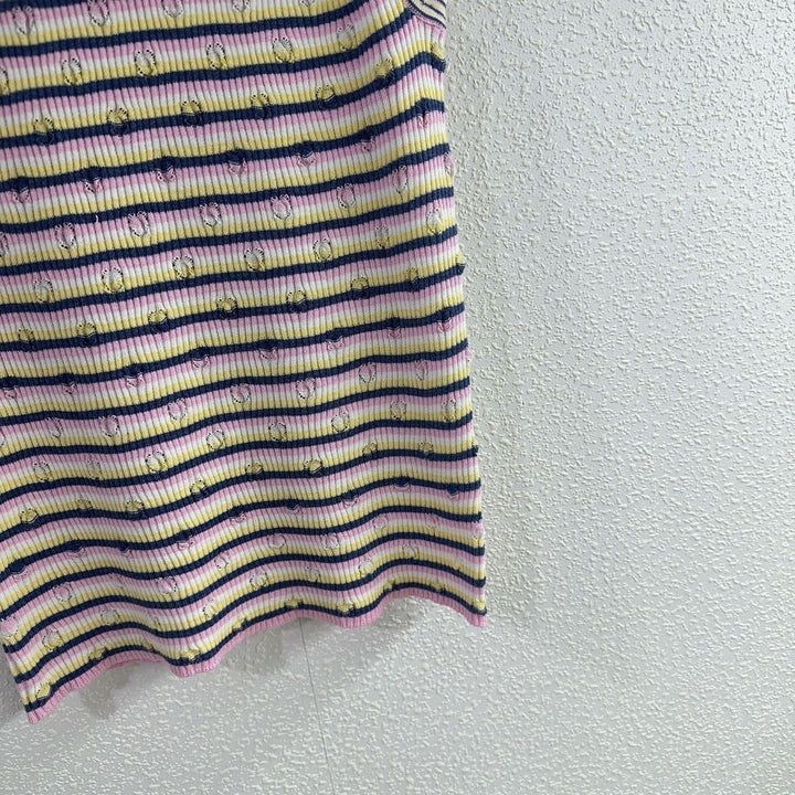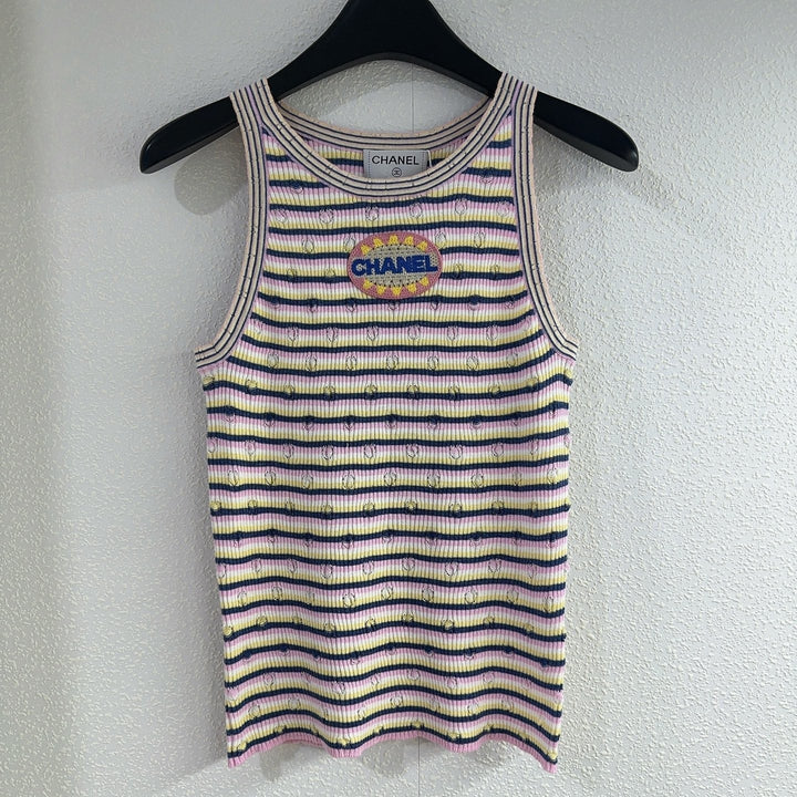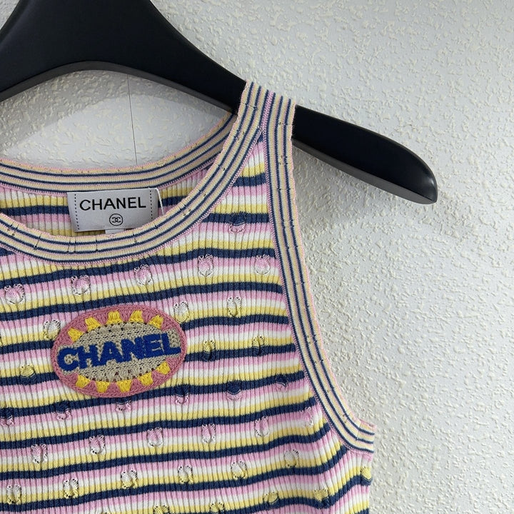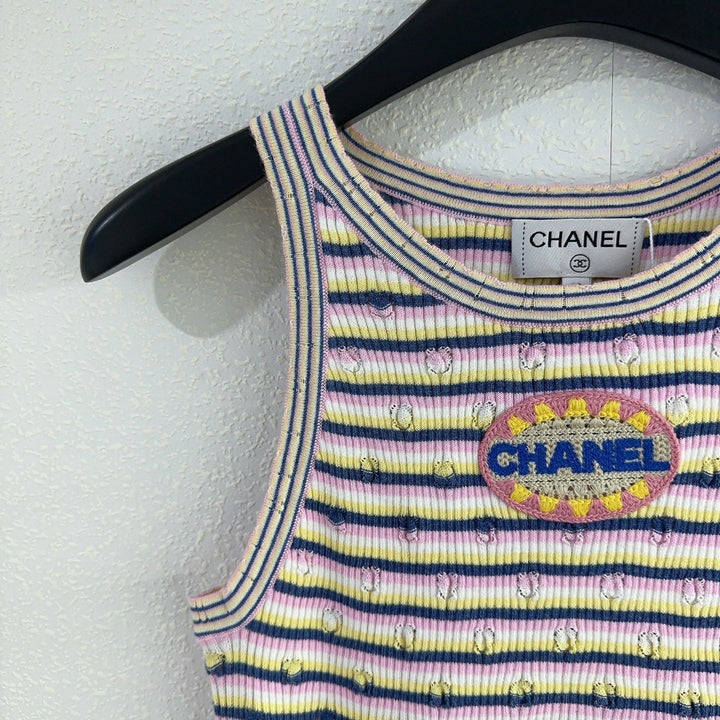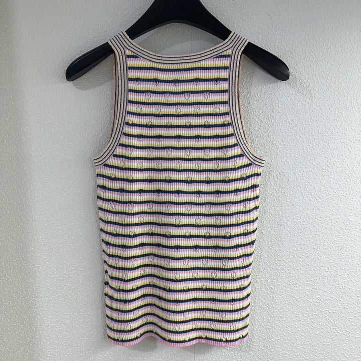 Customized YB imported wool knit material, fine texture, soft and comfortable, along with the striped trim, echoing the big body, adding a sense of modularity, the three-color stripes on the whole body are intertwined and ➕ the monogrammed logo embroidered and crocheted on the chest, highlighting the brand's character Slim fit, highlighting the figure, fabrics and auxiliaries developed, rounded-necked tank top silhouette, age-reducing and whitening on the top, versatile and versatile, matching with skirts and pants, adapting to the chic and foreign styles.