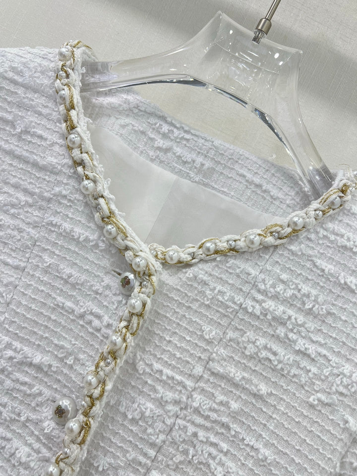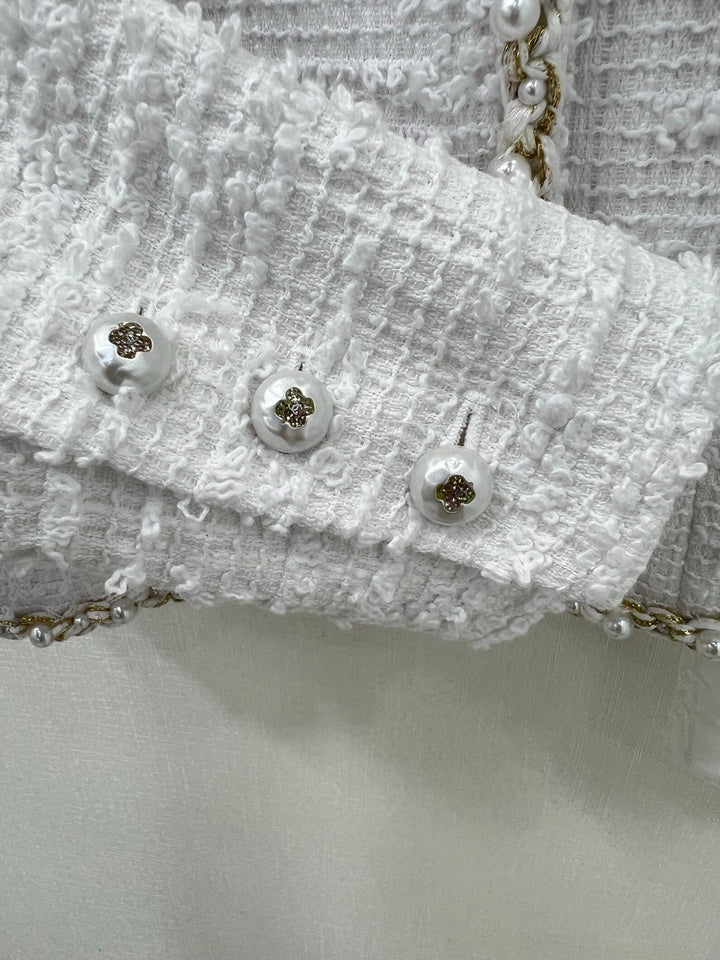 Original custom-made 100% silk lining, hand-sewn pearl trim. Pay attention to the details to distinguish between versions! Custom-made YB imported material with distinct texture and superior quality. Coarse fabric creates a classic style. Collar and cuffs feature meticulously hand-sewn pearls, exuding luxury while maintaining elegance. Ready-to-wear woven elements combined with handcrafted details, understated yet elegant, highlighting the refined taste of a high-society lady. The perfect choice for seasonal stylish outfits, a must-have for the sophisticated and fashionable. Custom-made fabric and lining, ensure the correct version, high-end version.