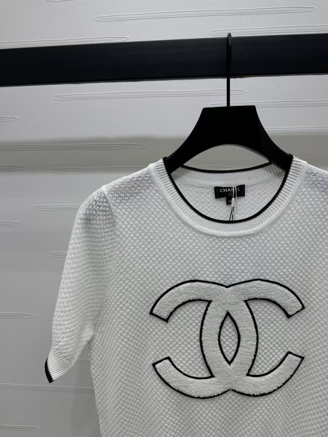 The latest collection for spring and summer 2025! Round neck contrast color double c knitted short sleeves! Oversized towel embroidery double c logo design on the chest Minimalist style casual and fashionable Classic version