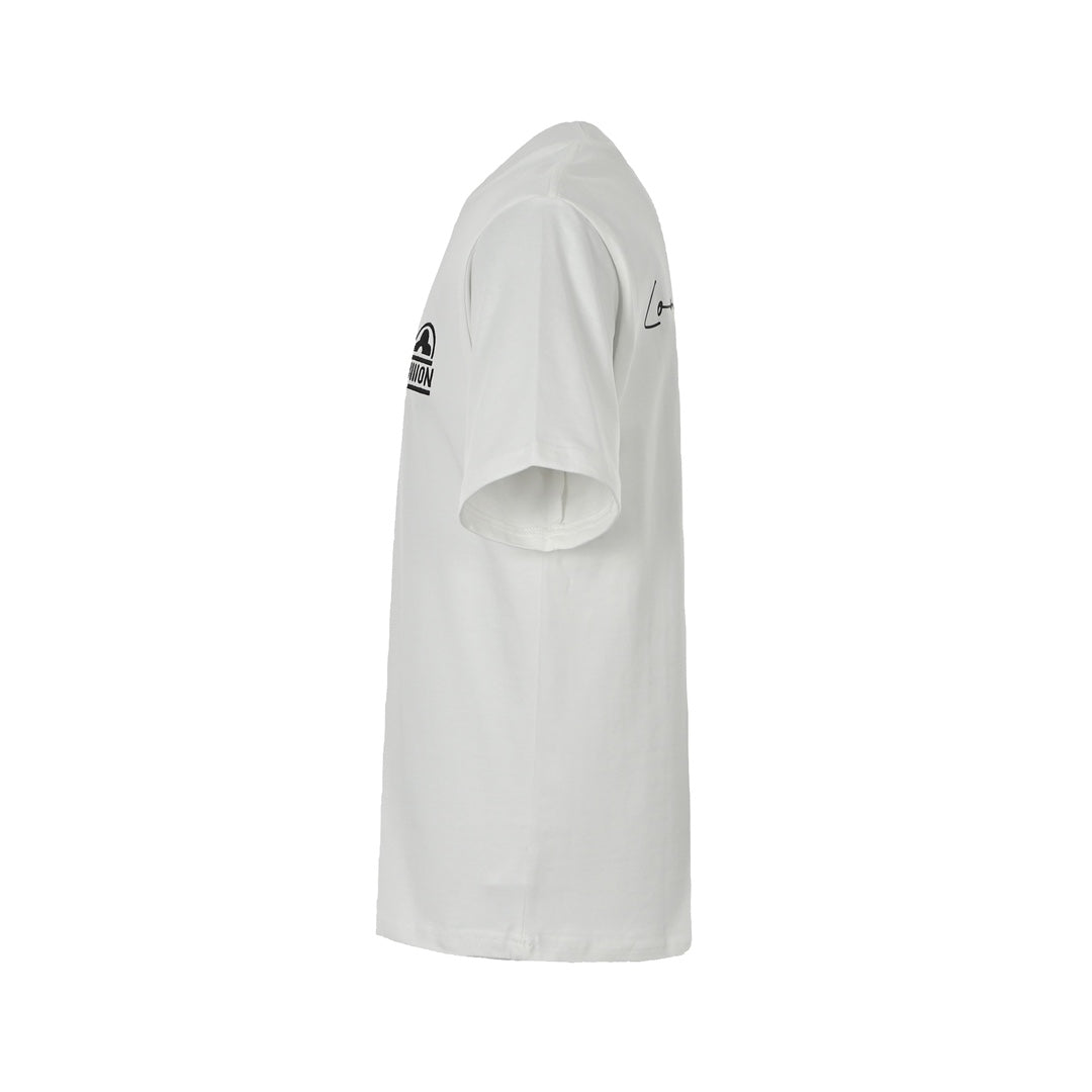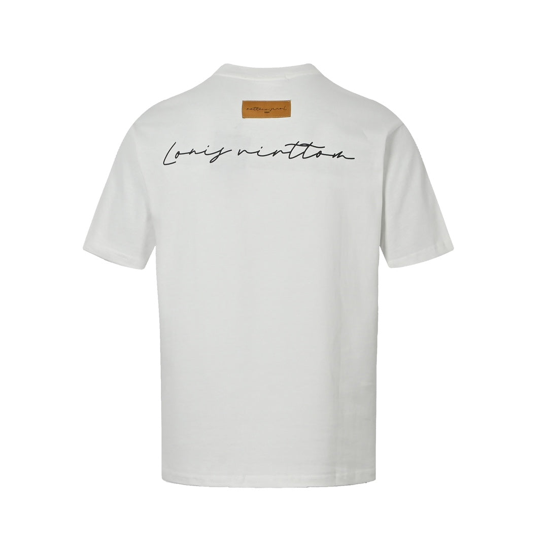 Short sleeves with small floral embroidery and cursive letters on the back