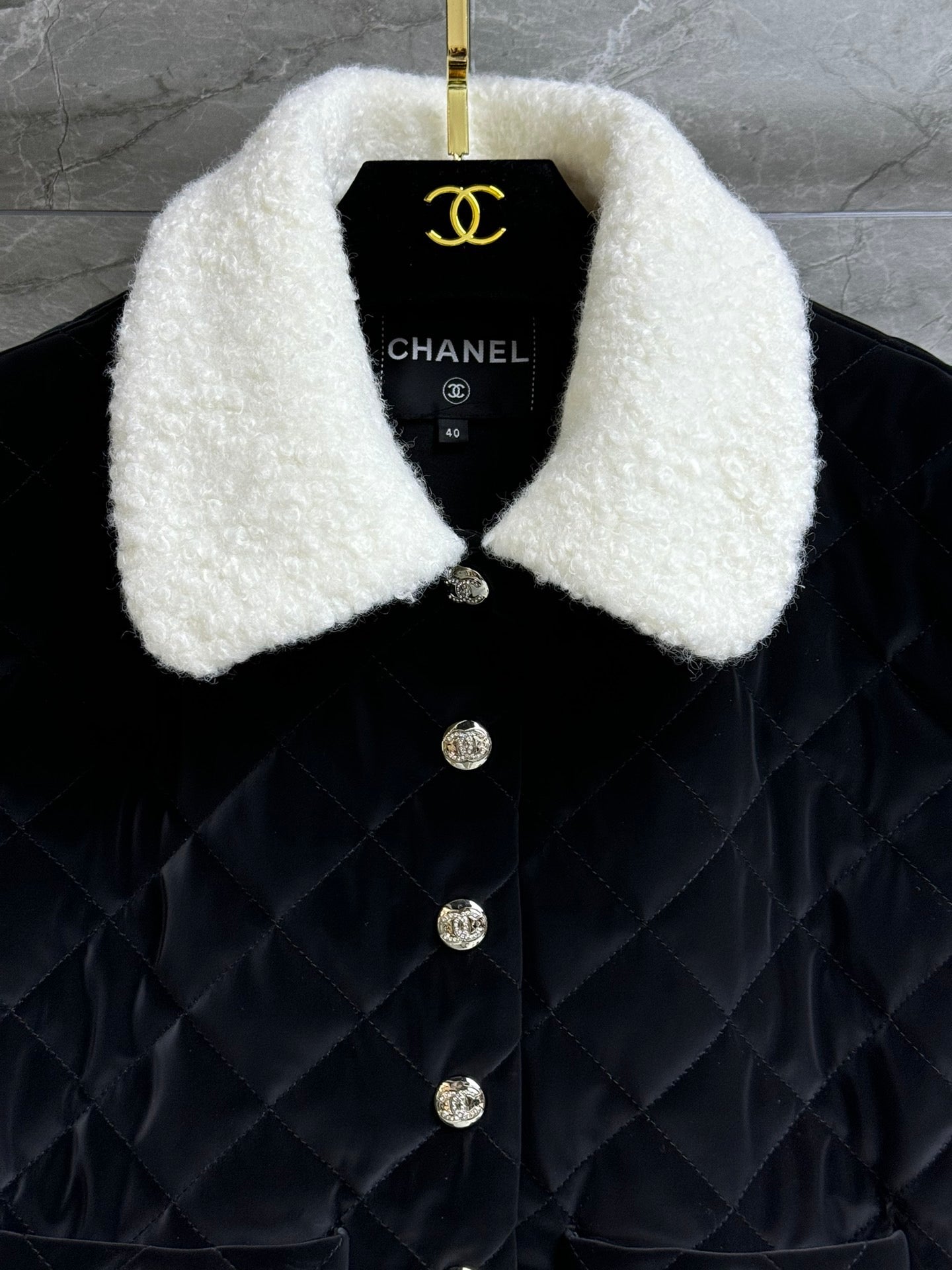 White lapel collar Quilted checkered pattern with exquisite diamond buttons Fashionable and stylish Customized matte frosted fabric Lambswool lining Fluffy feel Warm and comfortable Short version Makes you look slim and elegant