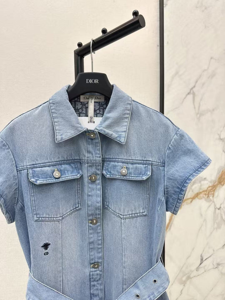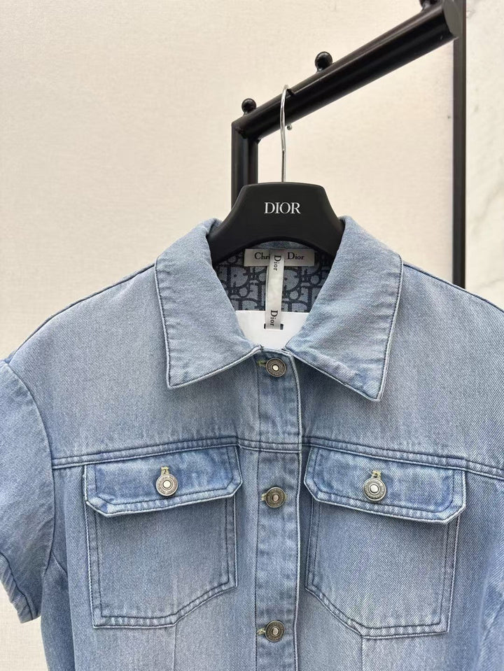 Stand-up collar + short sleeves + rolled hem + skirt + custom D-letter jacquard denim light blue washed fabric for a youthful, ageless look. Fashionable and sophisticated when worn, yet cool and stylish. Custom logo hardware and gold pocket embellishments. Imported denim fabric for a three-dimensional shape. A series of easy-to-match stylish outfits.