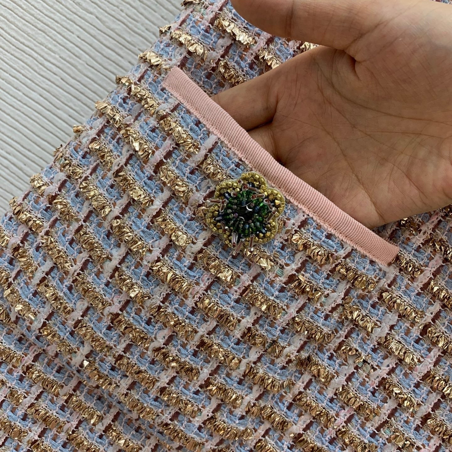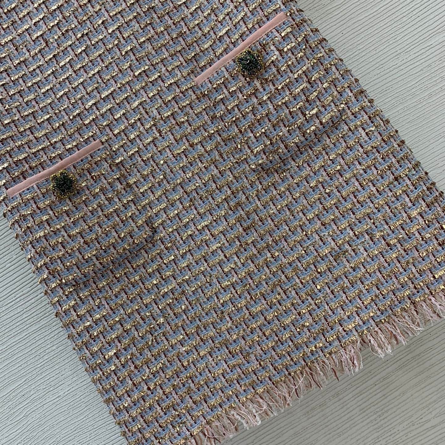 High-end custom-made gold thread Chanel style tweed woven tassel edge double pocket slim fit short-sleeved dress