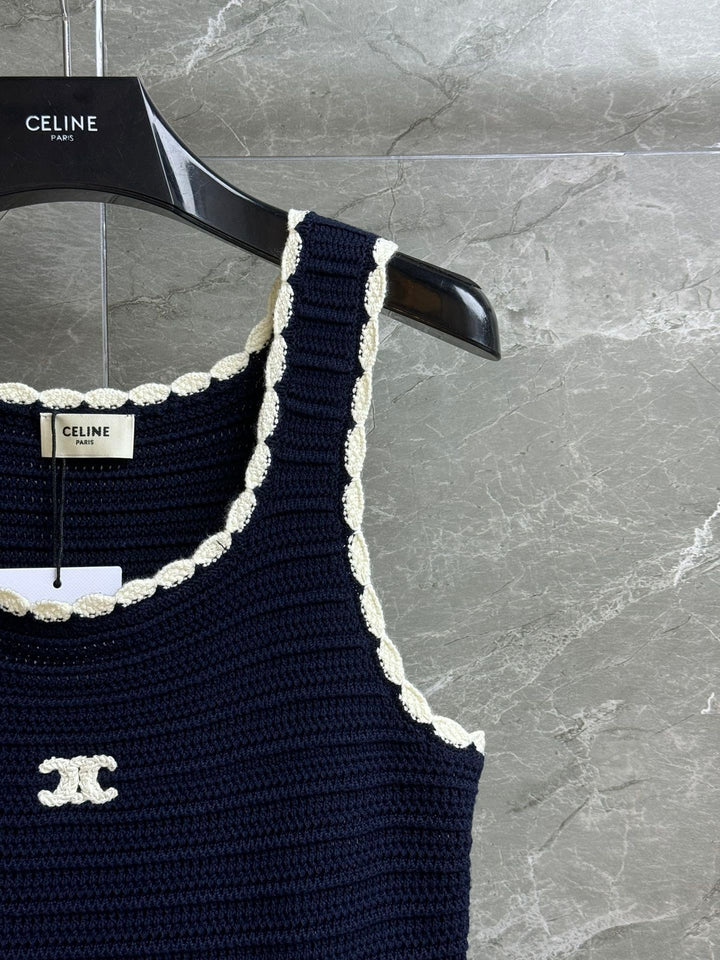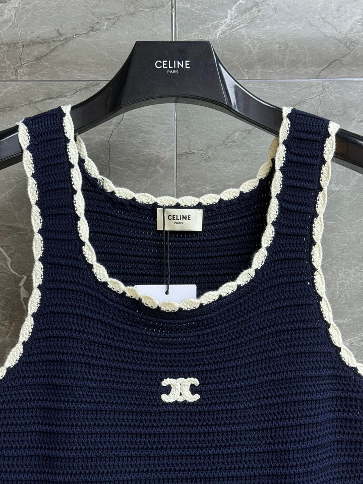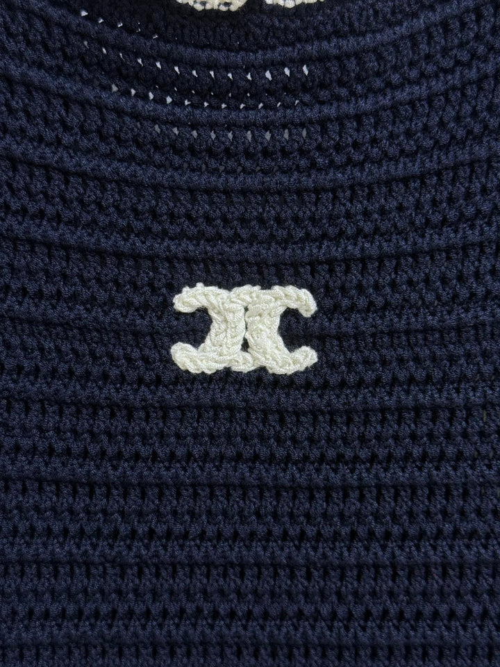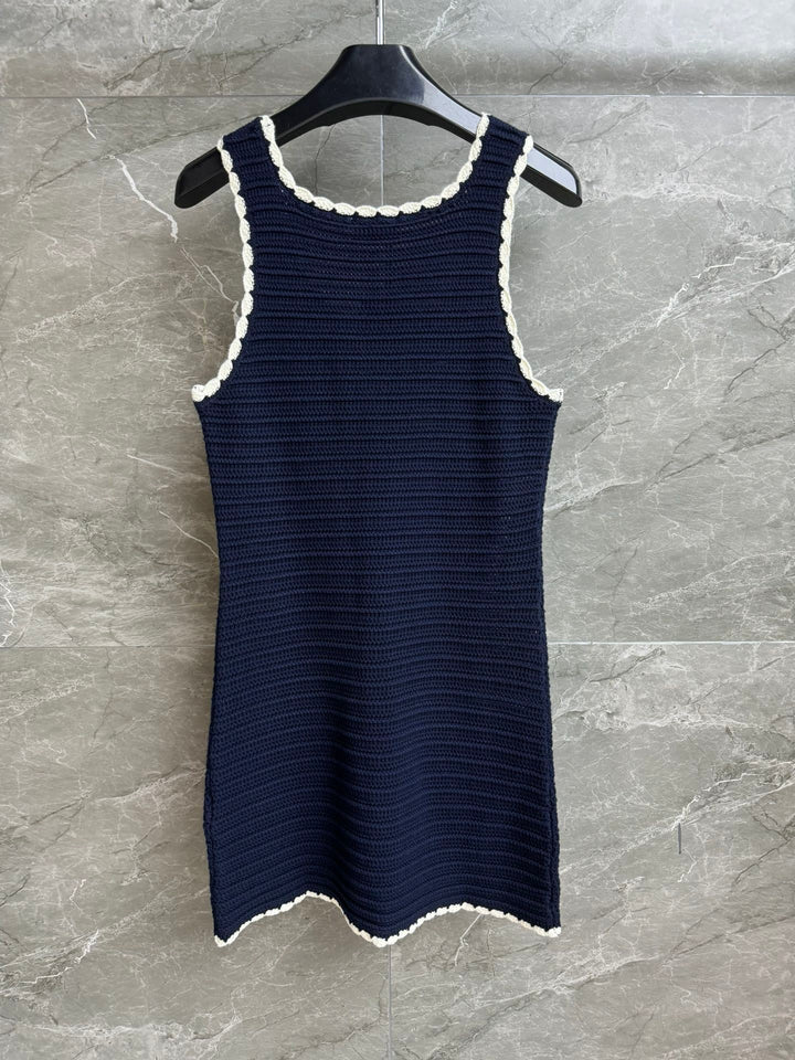 Needle-knit vest dress 2025 early autumn series Navy blue and white color block Arc de Triomphe logo embellishment Heavy-duty crochet knit texture Bohemian vacation style Lazy and sophisticated Cotton knit fabric Comfortable and skin-friendly A-line skirt silhouette Slimming and elegant fit Complete with trademarks