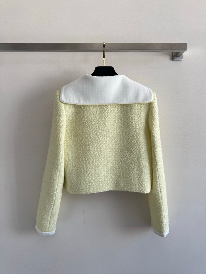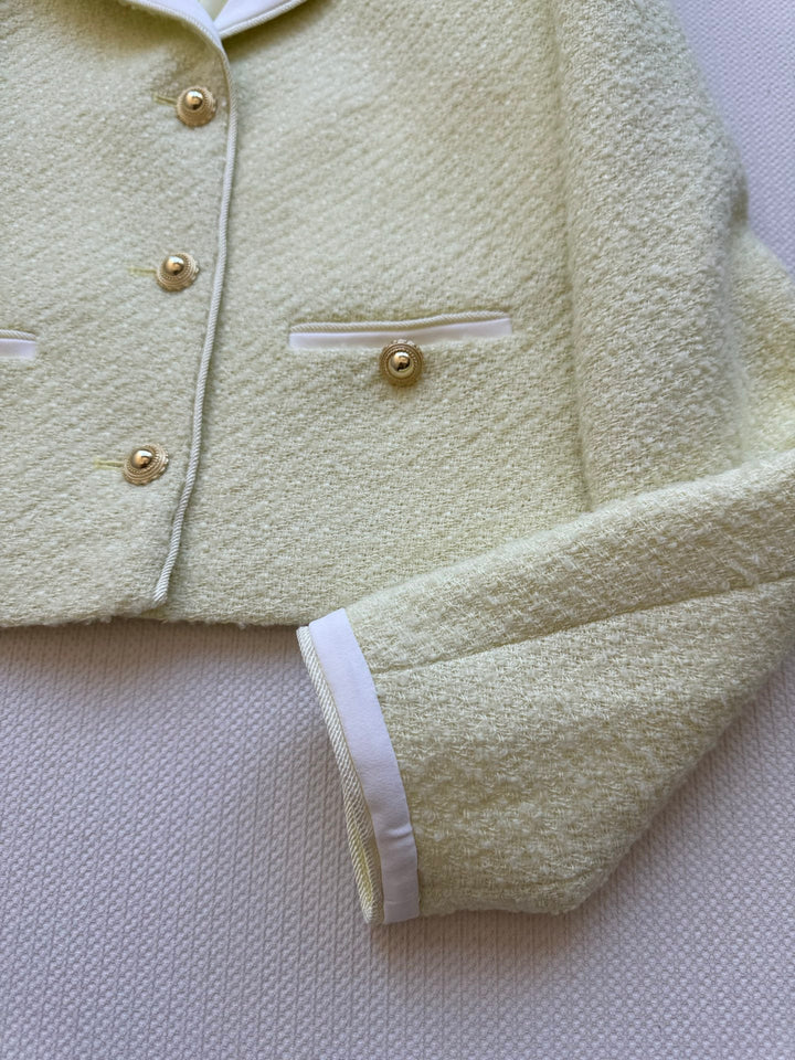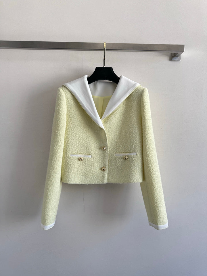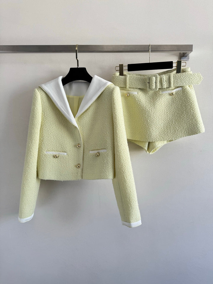 25 new navy collar Chanel style suit. Contrast navy collar design with exquisite double pocket embellishment. ✨ The short version enhances the body proportion. Paired with the same belted culottes, this set is absolutely stunning. It is simply the outfit of a chaebol daughter. The top is youthful and smart without losing the elegance and sweetness! This yellow is very whitening👍 Wearing it gives off a ladylike temperament, plus the overall color is also healing and beautiful🤩 A must-have for fair-skinned and wealthy women~