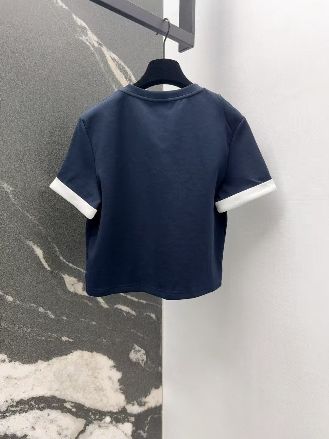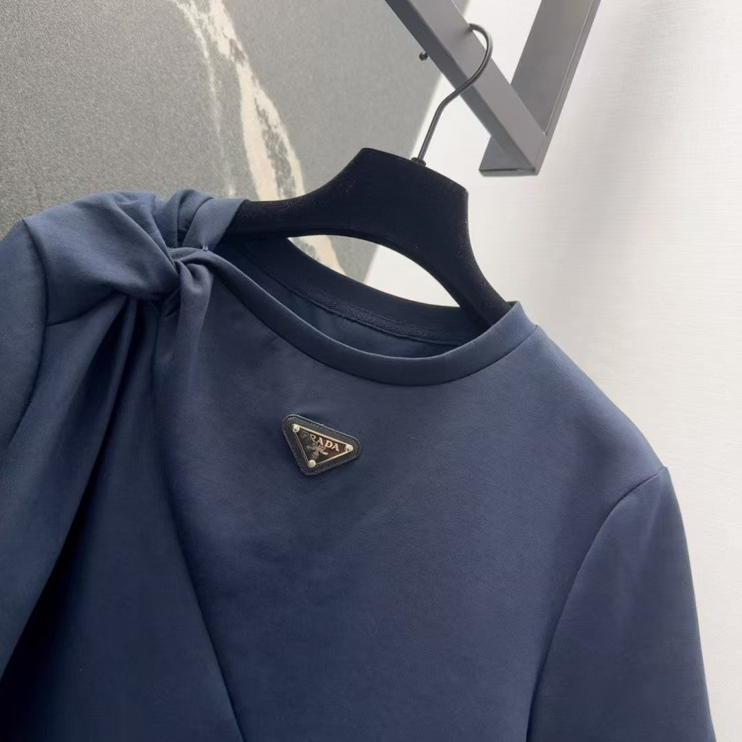 25ss———Spring and summer new product college style contrast color leisure classic triangle label twisted short sleeves with slit skirt casual casual feeling a set of matching version of the upper body is very thin high-quality pure cotton fabric light breathable without losing the sense of crispness close to the body very comfortable age-reducing leisure style lazy and fashionable daily wear essential
