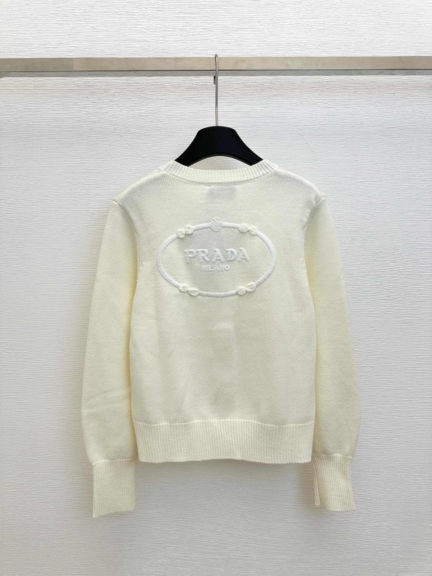 Knitted round neck long-sleeved cardigan with embroidered relief on the back