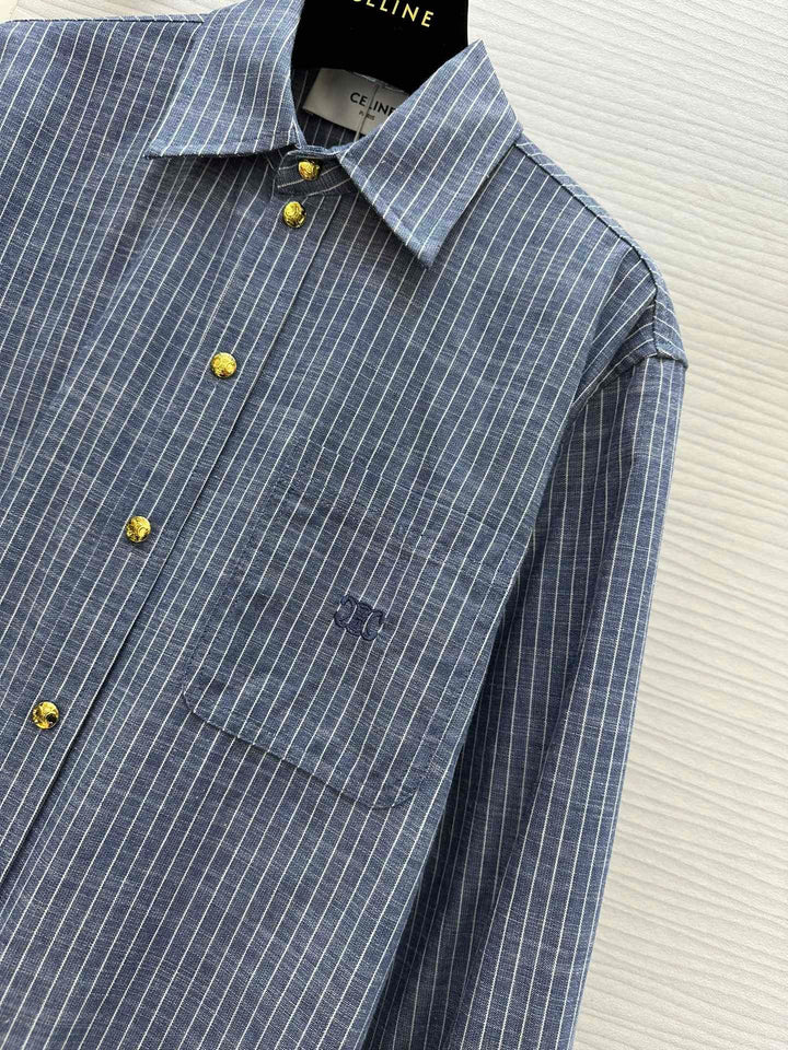 Denim cotton striped shirt. The original customized fabric has a great texture. Three-dimensional tailoring, loose and short, H-fit. Fashionable and handsome. Pocket embroidery.